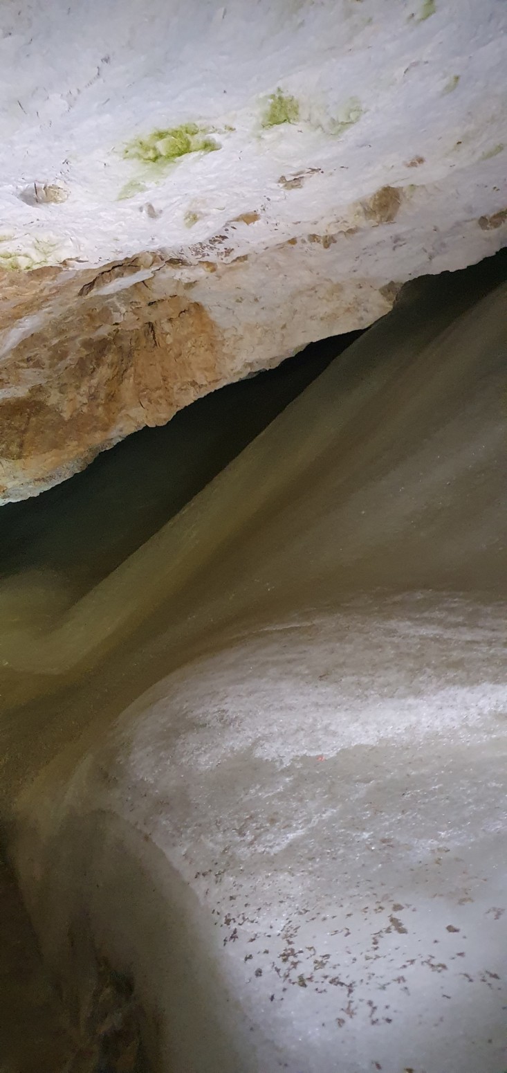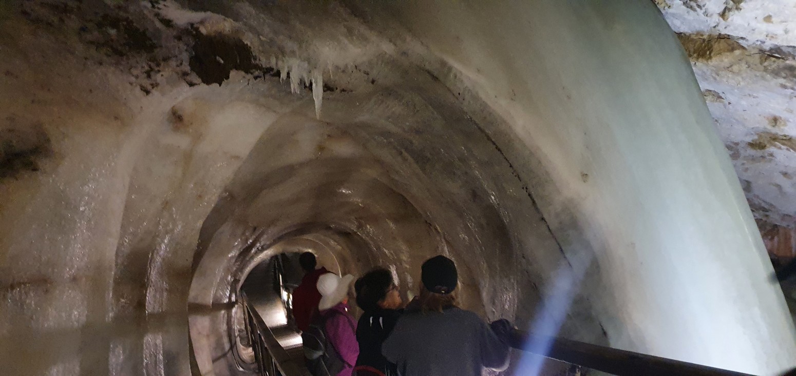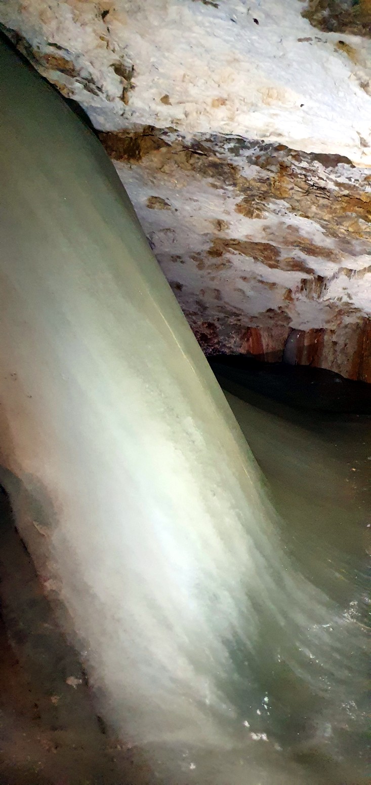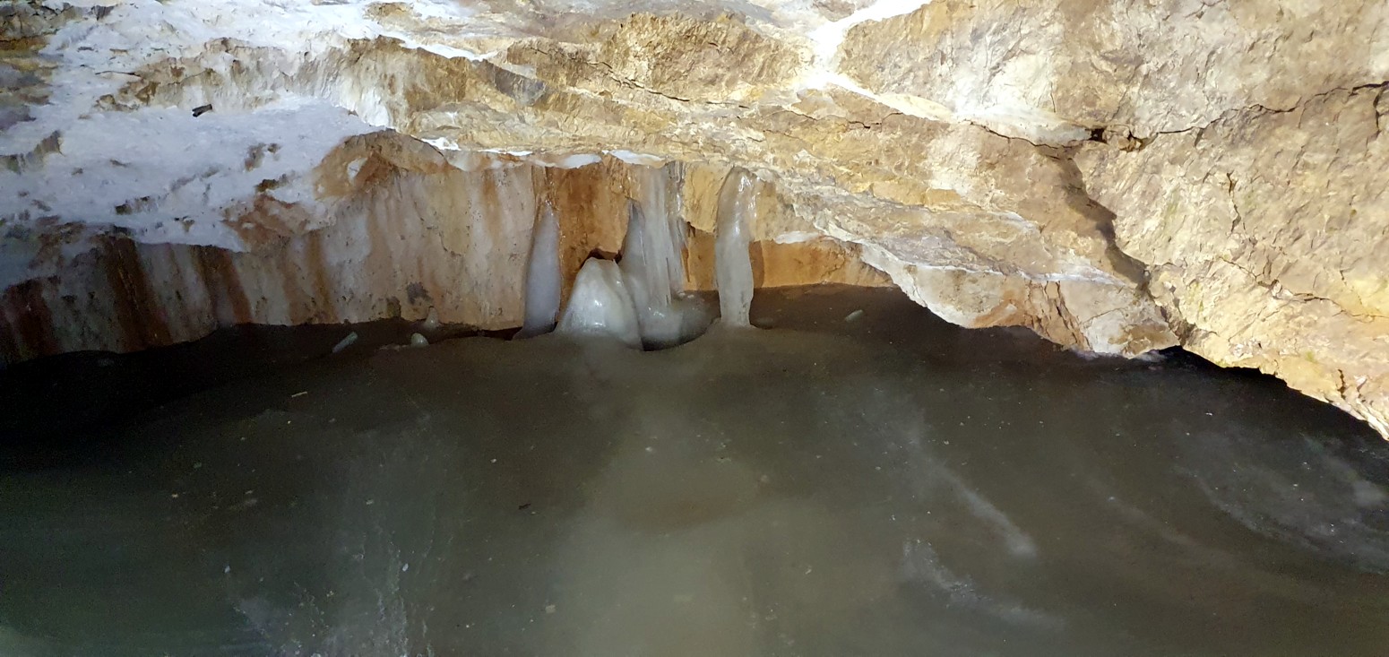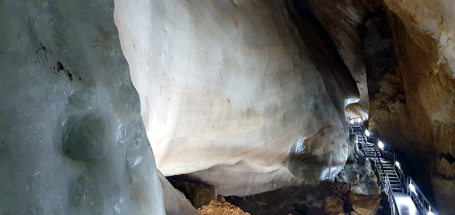 algunas partes como en la gran sala un espesor de 26,5 metros que forman multitud de lagos helados, cascadas, estalactitas y estalagmitas