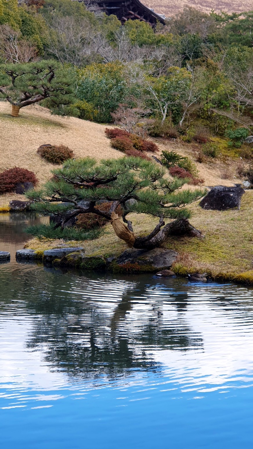 "paisaje prestado". Isuien significa "jardín fundado en el agua", y el nombre del jardín se deriva del hecho de que sus estanques son alimentados por el pequeño río adyacente