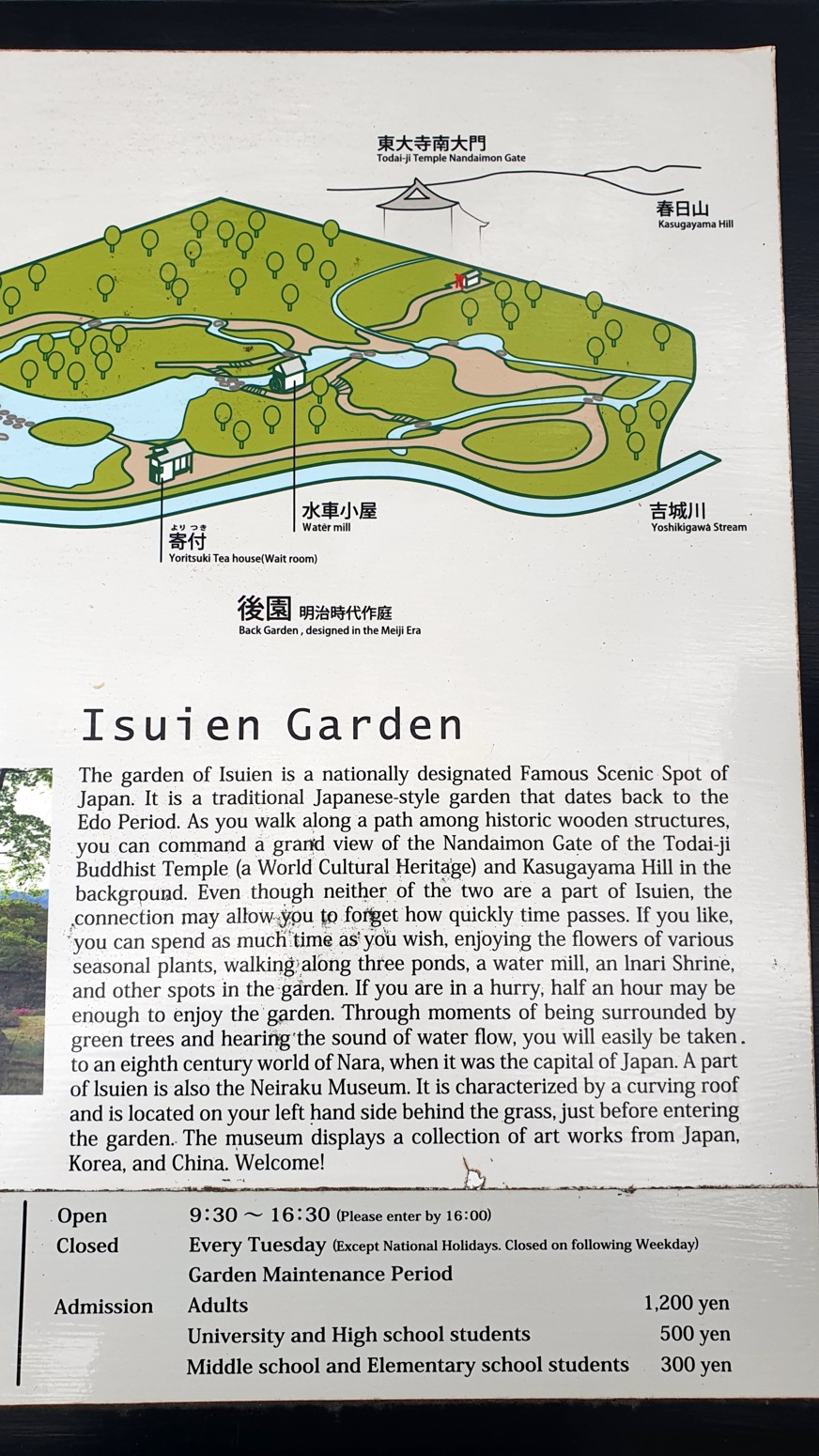 Isuien es un atractivo jardín japonés con una variedad de características, como el uso de la Puerta Nandaimon del Templo Todaiji y el Monte Wakakusayama como