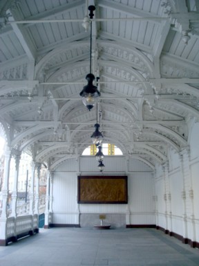 corredores con columnas llamados "kolonadas", algunas de mármol, otras de madera