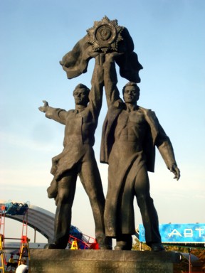 representa a unos trabajadores rusos y ucranianos sosteniendo el Símbolo