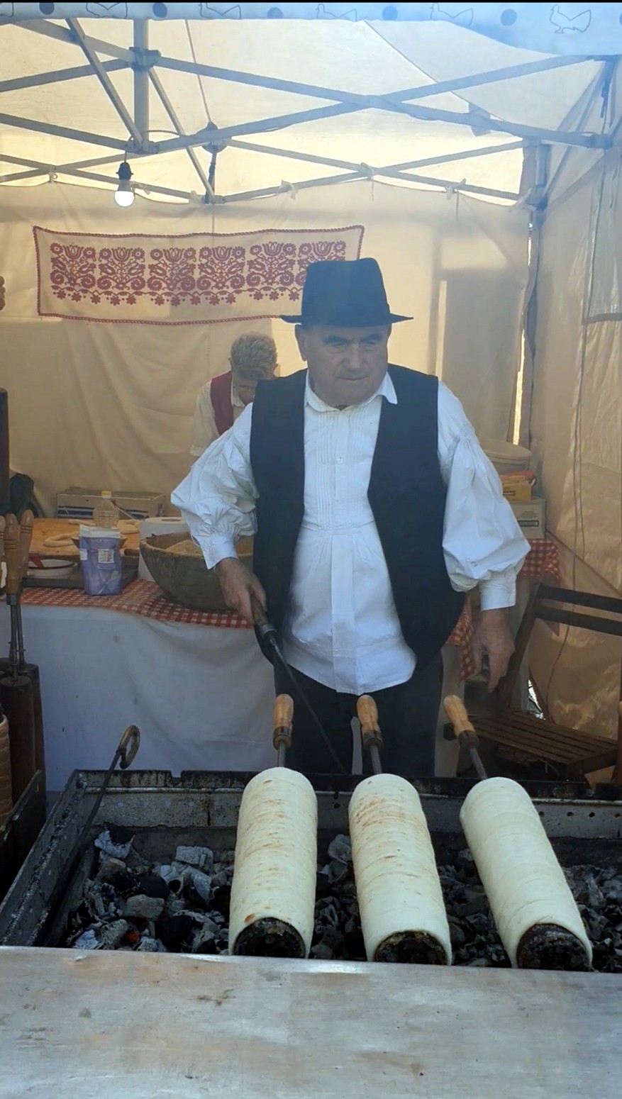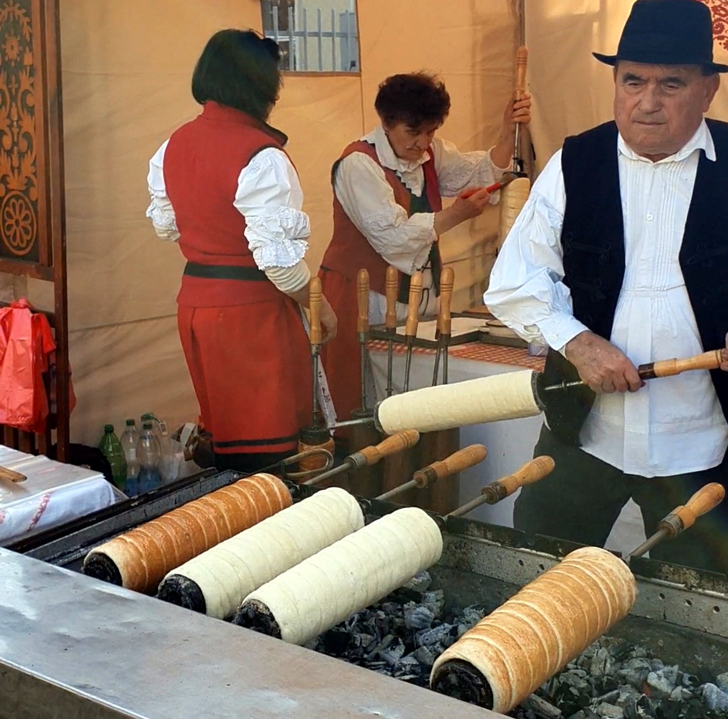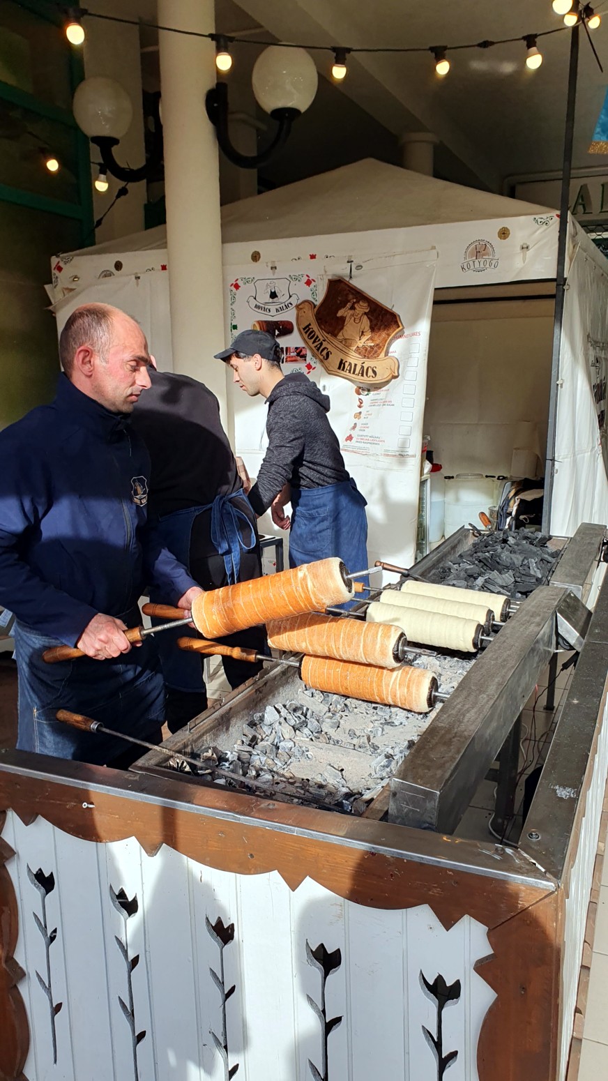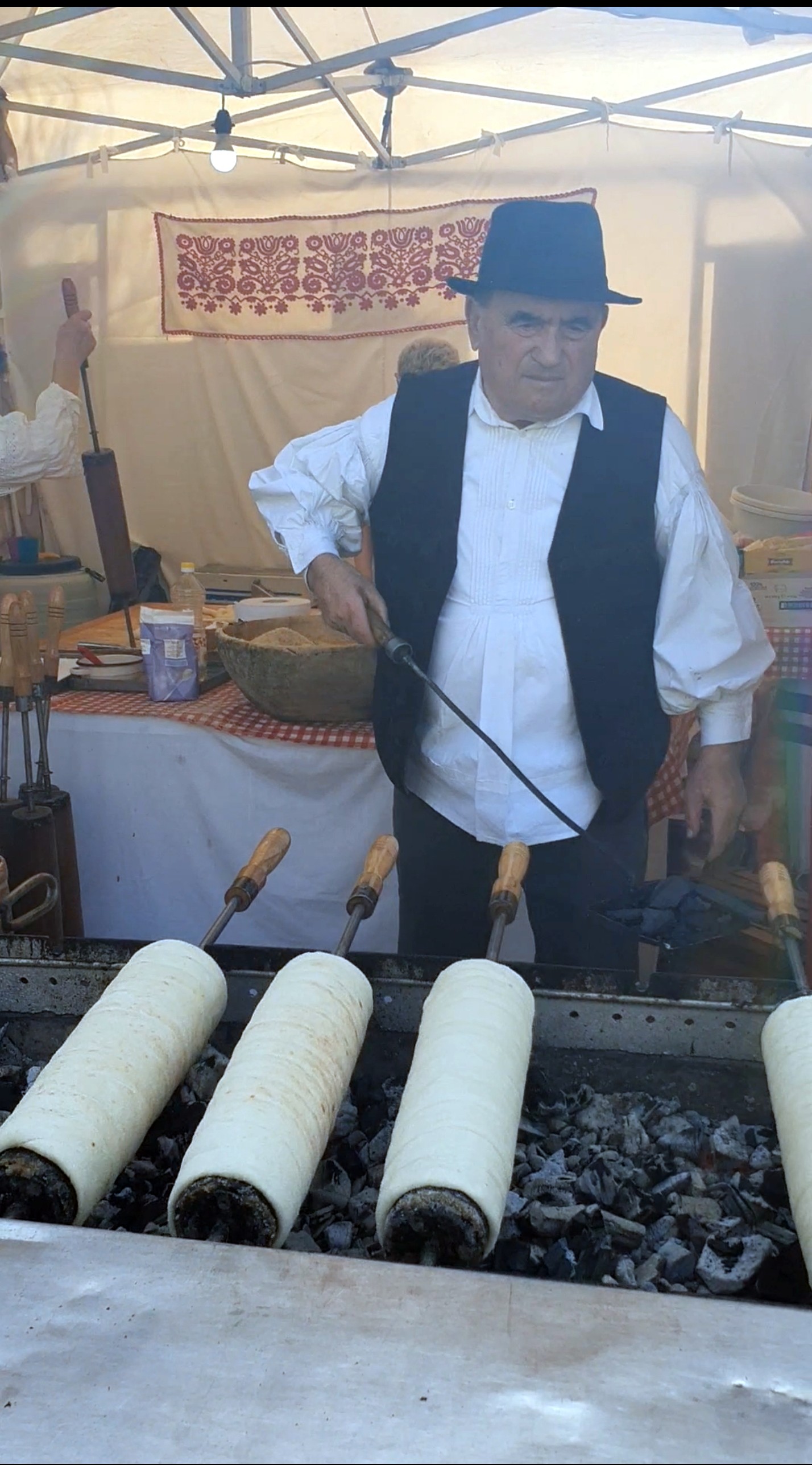 superficie adquiera un color marrón dorado. Durante el proceso de horneado, el azúcar pegado a los kürtoskalács se carameliza y forma una