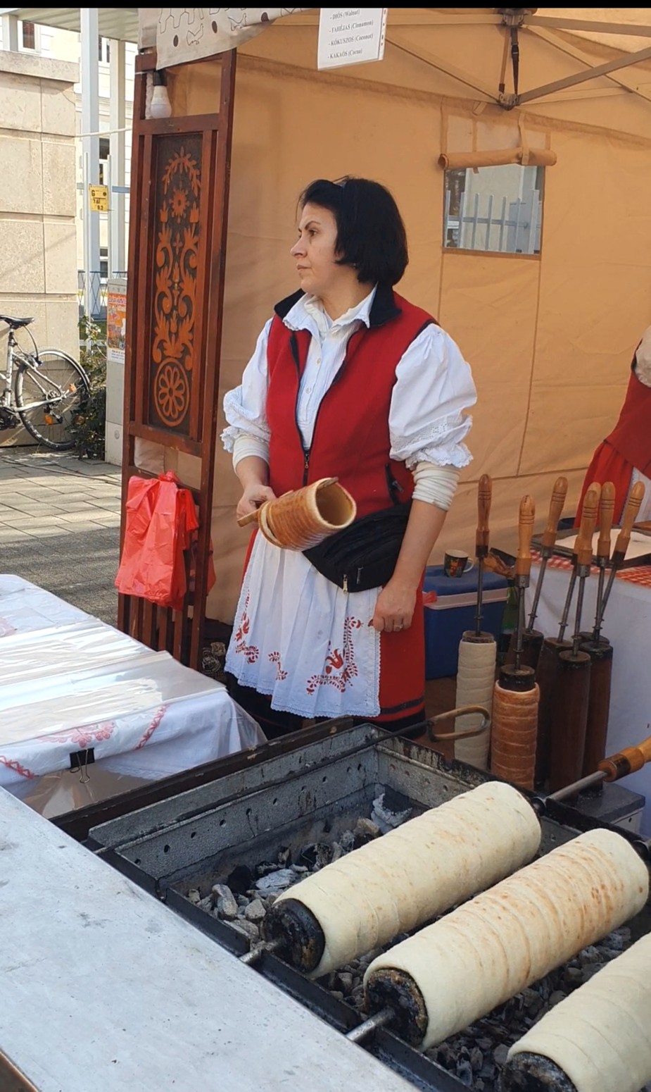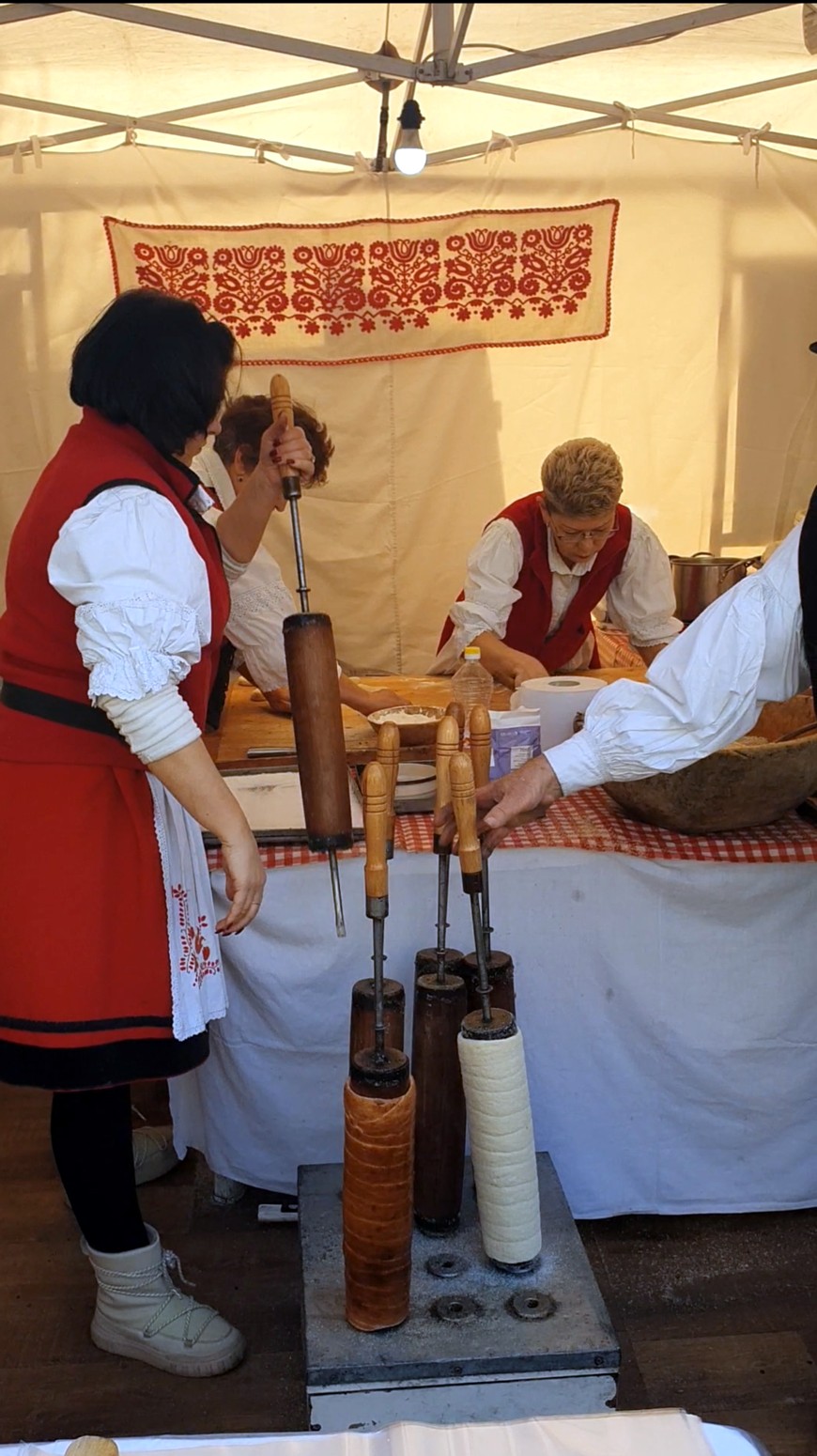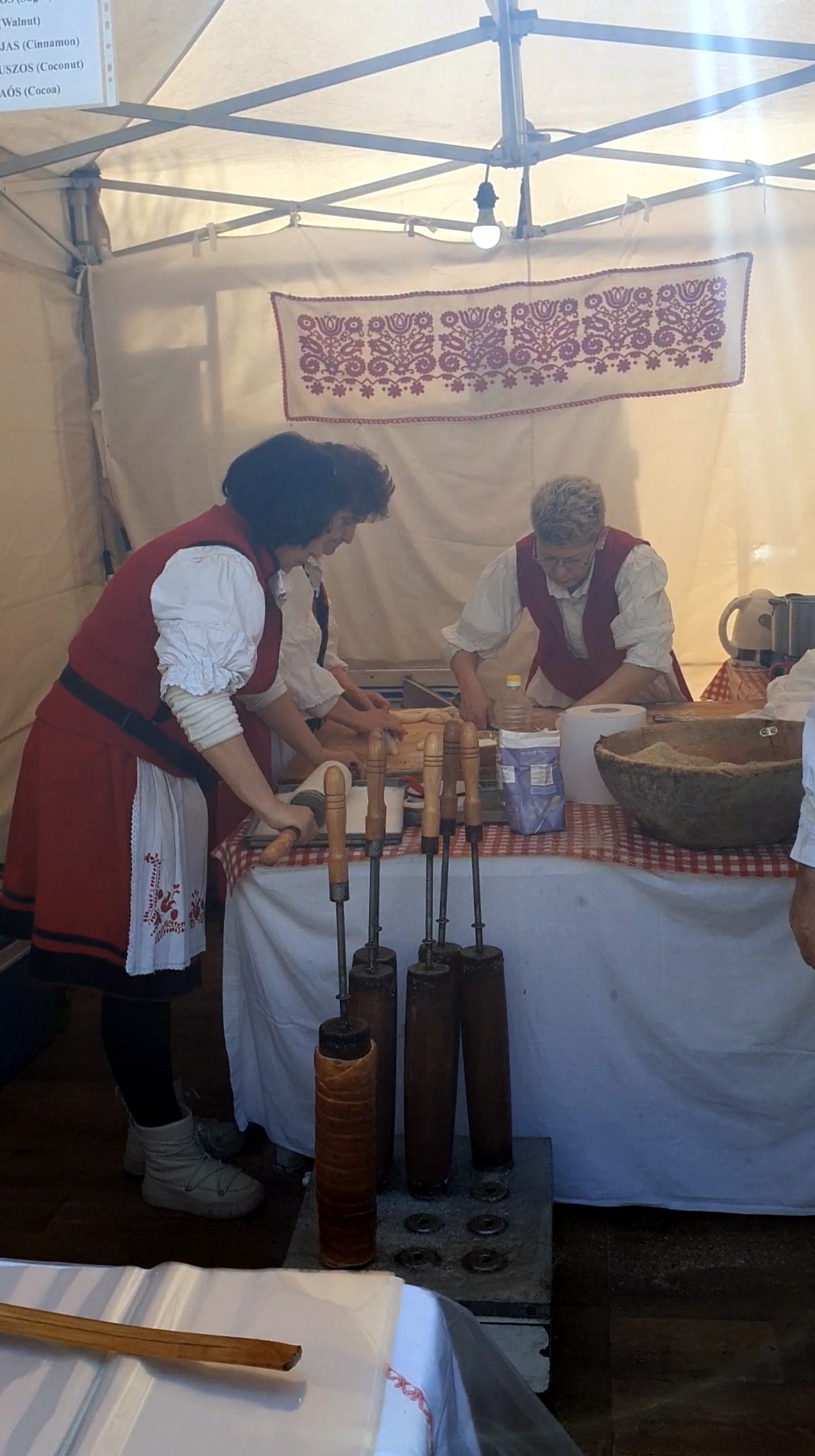 El kürtoskalács está hecho de masa dulce de levadura, la cual se hila en una tira y luego se envuelve alrededor de un asador de