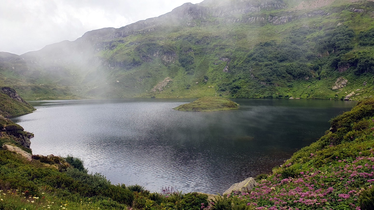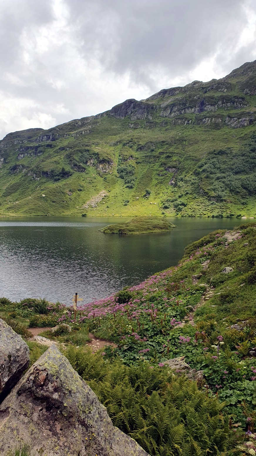 Accesible solo a pie, magníficas vistas de la Chaîne des Fiz, el lago y su islote se encuentran bajo la Pointe Noire de