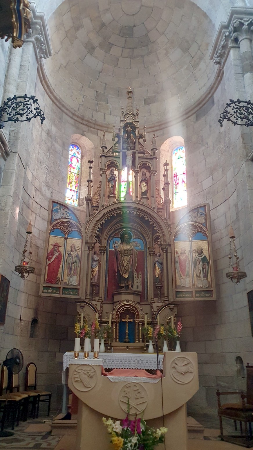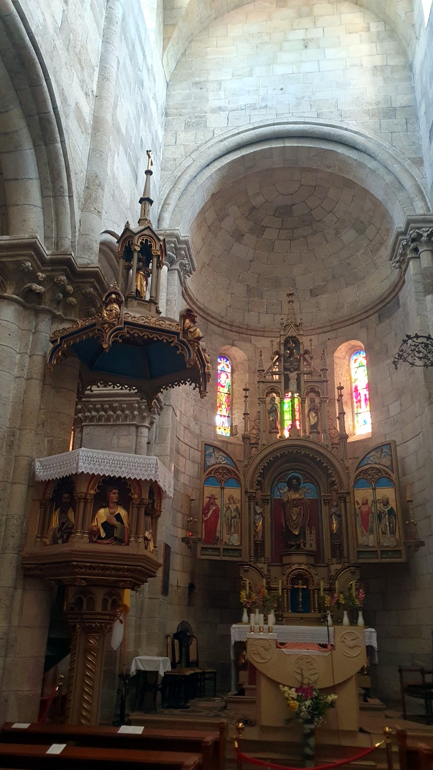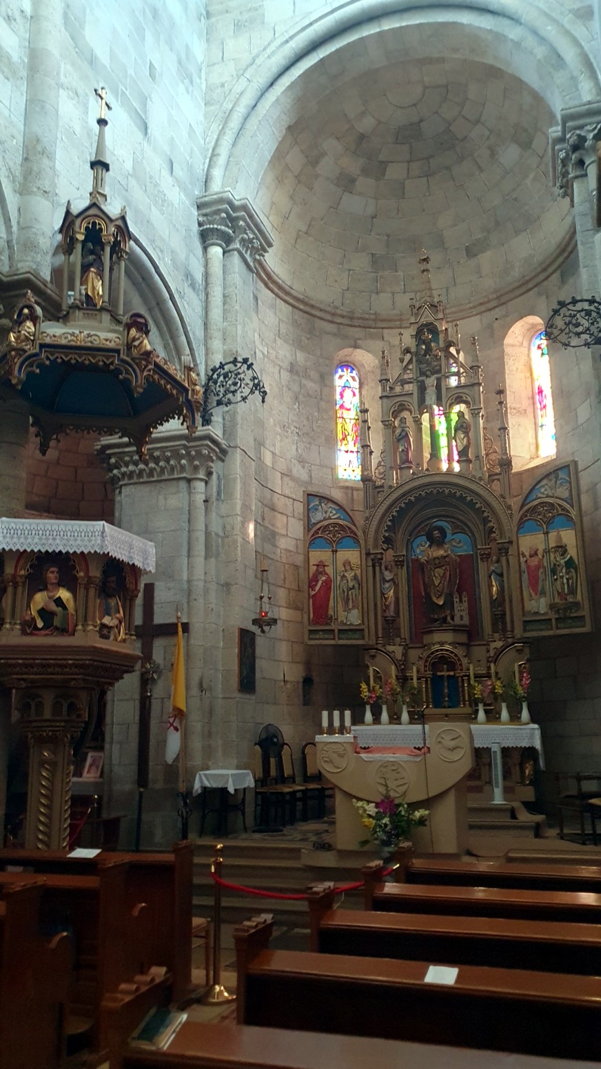 La luz se filtra a través de las vidrieras altas, no hay mucha decoración en las paredes (aparte de los capiteles).