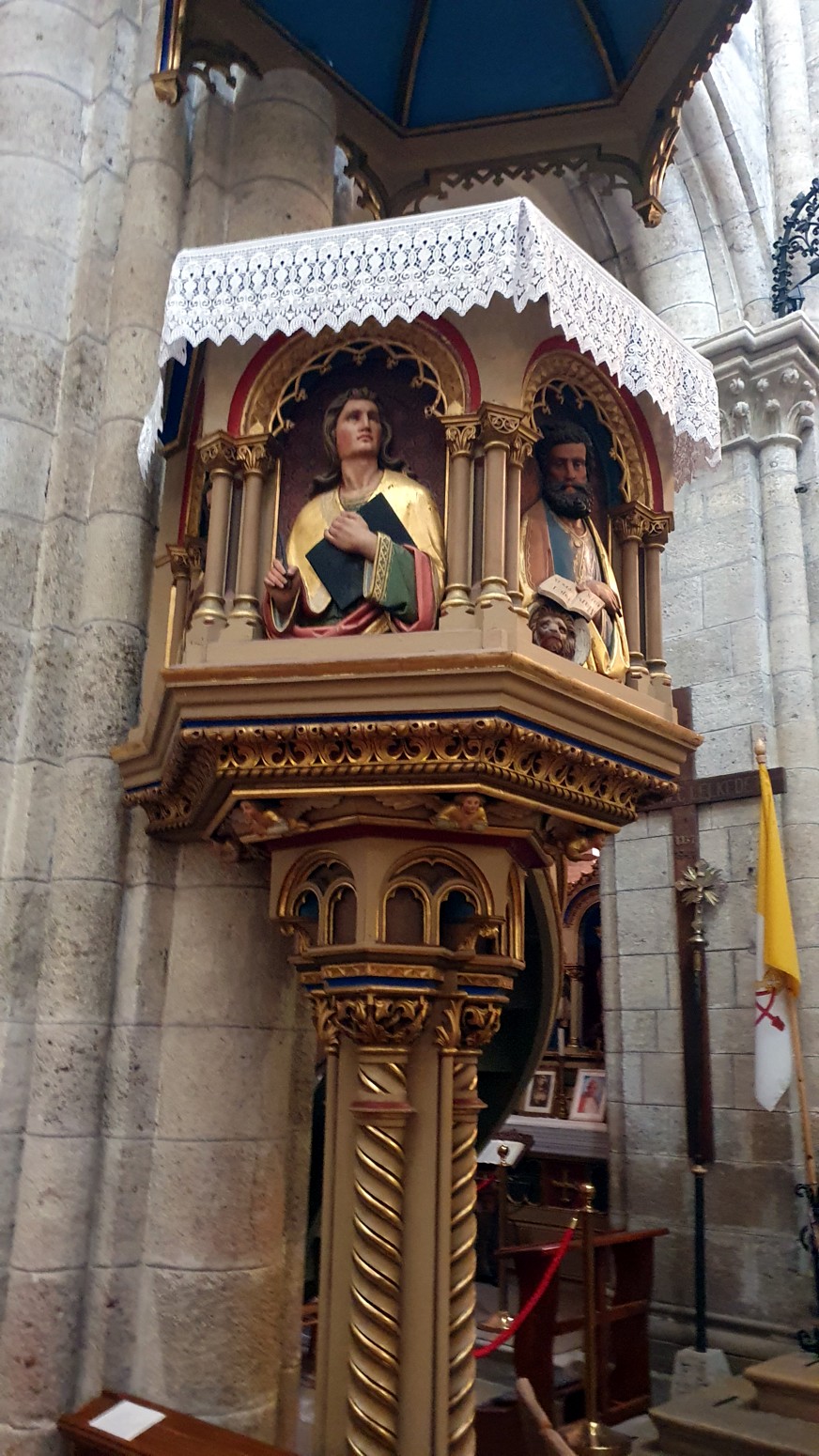 las que el espacio de la pared entre las columnas está lleno de tallas extremadamente ricas de enredaderas y hojas de acanto.
