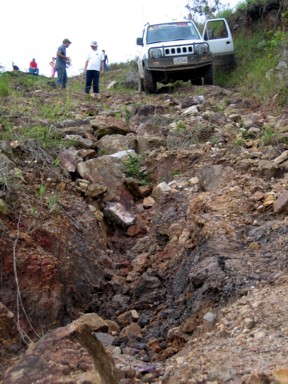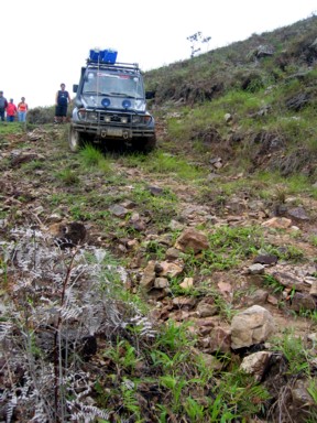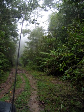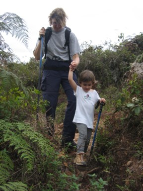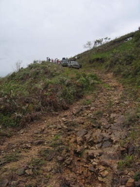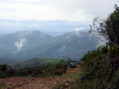 Desde Cuicas, algunos familiares de nuestro amigo, se ofrecen para hacer de guías en algún recorrido por los alrededores. Nos recomiendan una excursión al Salto Loro, aunque el camino estará difícil, pues se pasó toda la noche lloviendo. En seguida que salimos de Cuicas, la pista totalmente embarrada va tomando altura, y vemos como nos encontramos totalmente rodeados de montañas (foto 1), pero vamos de bosque en bosque y entre la vegetación, la niebla y el barro, avanzamos despacio (foto 2). Llegamos a un punto donde evidentemente hace ya muchos años que por allí no pasa ningún vehículo, la pista prácticamente desaparece (foto 3), además de que se complica con fuertes subidas y bajadas (foto 4), y con pasos complicados (foto 5), además comienza a chispear, y no necesitamos más barro para salir de allí. Al final ya no hay posibilidad de continuar, y hay que bajarse de los vehículos y calzarse las botas como Ana Sofía (foto 6). Si queremos llegar al Salto Loro, tendrá que ser caminando...