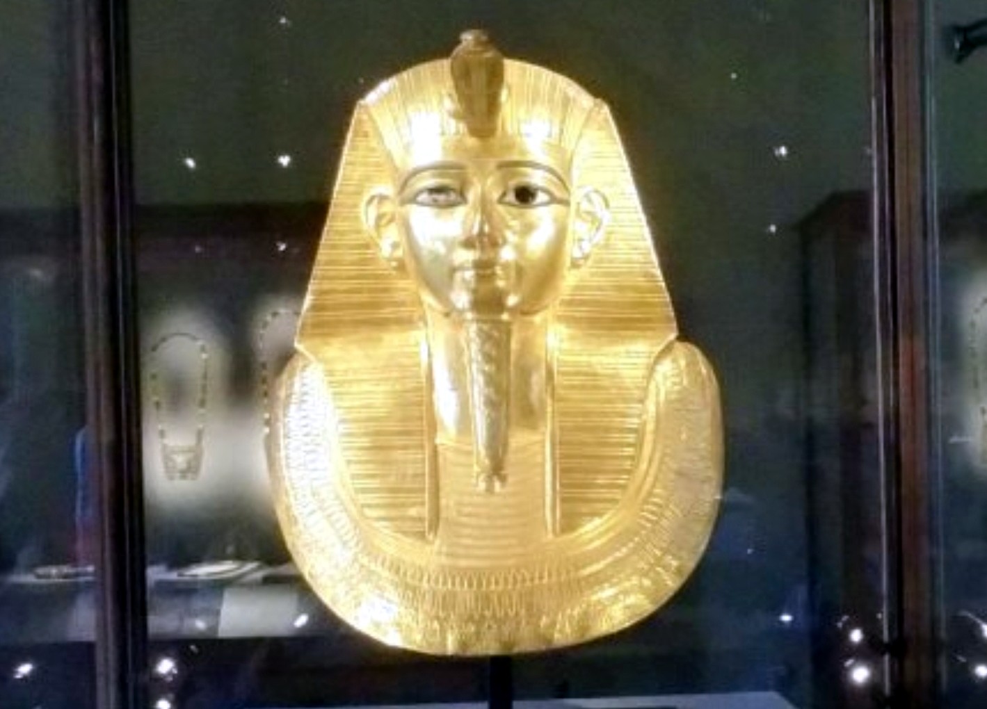 la máscara de oro que se encontró junto con otras 5,000 piezas dentro de la tumba. y por otro lado, la que contiene los restos momificados de los