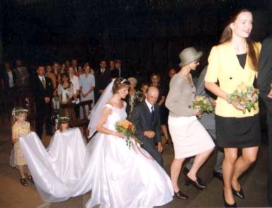 de la mano de papá y precedida por los seis padrinos amigos de los novios, mientras que