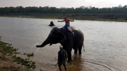 Al atardecer el río en Chitwan esta lleno de elefantes con sus respectivos