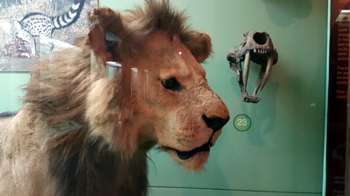 El espacio central, esta ocupado por una selección de grandes mamíferos entre los que destaca el esqueleto con enormes colmillos