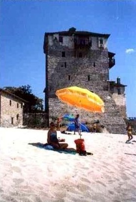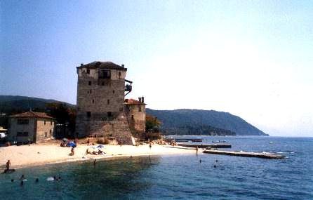 Desde Ouranópolis o Uranópolis que acertadamente significa "ciudad del cielo", es de donde parten las embarcaciones tipo golondrina que bordean la costa de Monte Athos cargadas de turistas que fotografían los monasterios colgados de las paredes de la montaña, es un lugar pintoresco, apacible y tranquilo (foto 1), donde en sus muchas terracitas al aire libre podréis probar la típica ensalada griega o un buen pulpo, y contemplar su elegante faro de otras épocas (foto 2), también podréis elegir entre visitarlo por dentro y subir hasta lo alto, o tomar el sol y un baño a sus pies como hicimos nosotros (foto 3)...