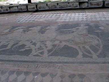con carteles indicando que en el museo situado en la entrada, se encuentra el mosaico que