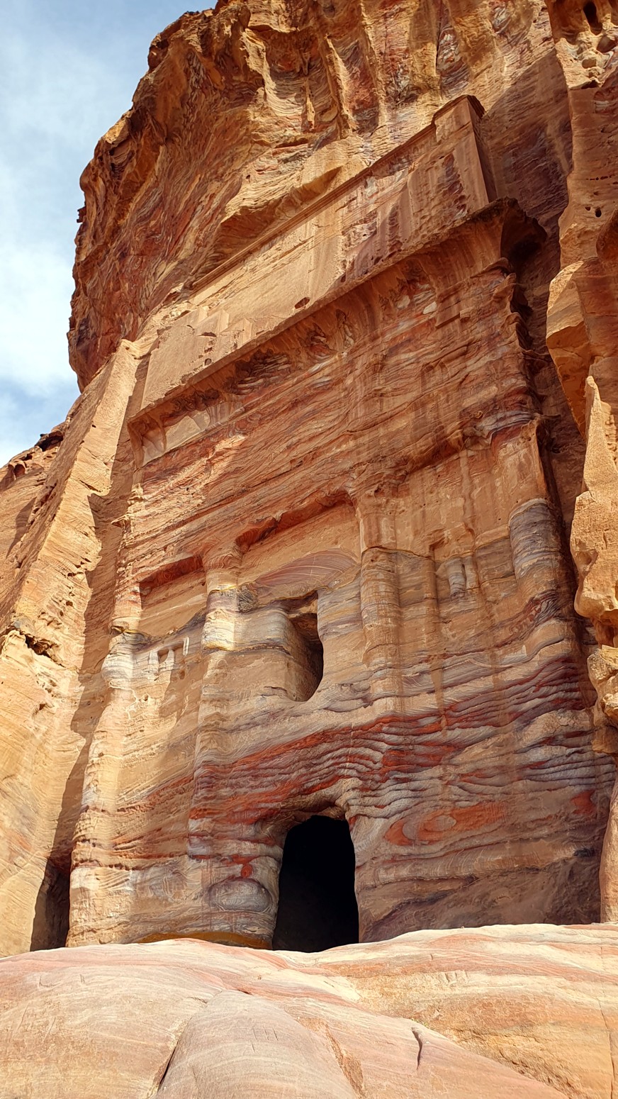 nombre debido a los colores veteados que refleja la roca de su fachada. Se cree que la tumba está dedicada a una deidad.