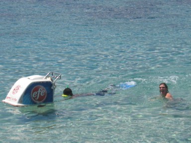 sus gafas y tubo de bucear que llega con su carrito de helados con campanitas y