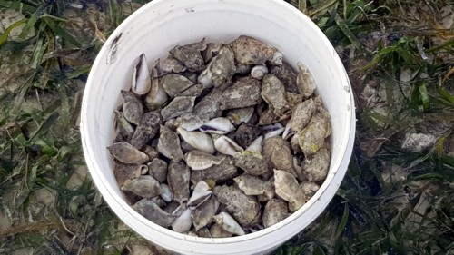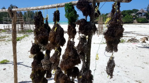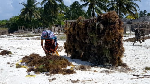 caracolas, las grandes para comer, y las pequeñas para hacer collares. Y otros sembrando unas algas, que