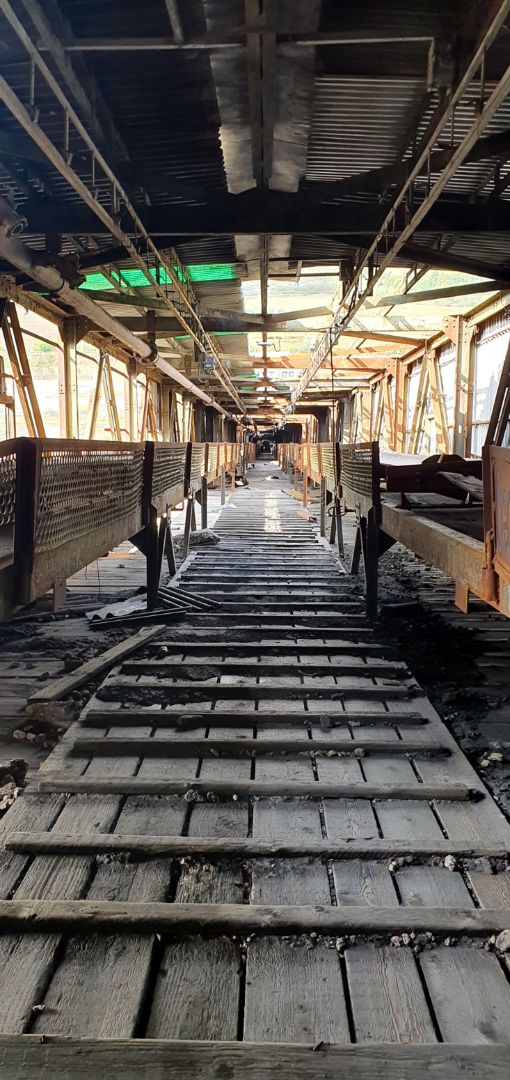 Hoy se puede seguir el recorrido del proceso de funcionamiento de la planta, desde el ferrocarril que transportaba el lignito a las cintas que lo
