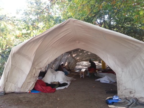 habilitado unas grandes tiendas de campaña militares a modo de campamento que ocupa todo el gran solar entre el conjunto de