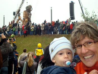 y música en directo que seguía a los gigantes, decenas de