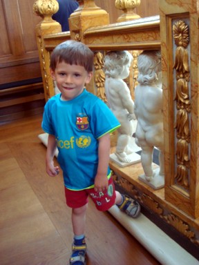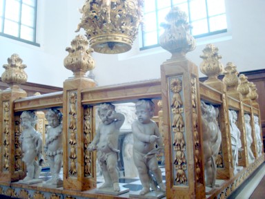 bautismal, con una balaustrada dorada sostenida por niños de mármol de su tamaño