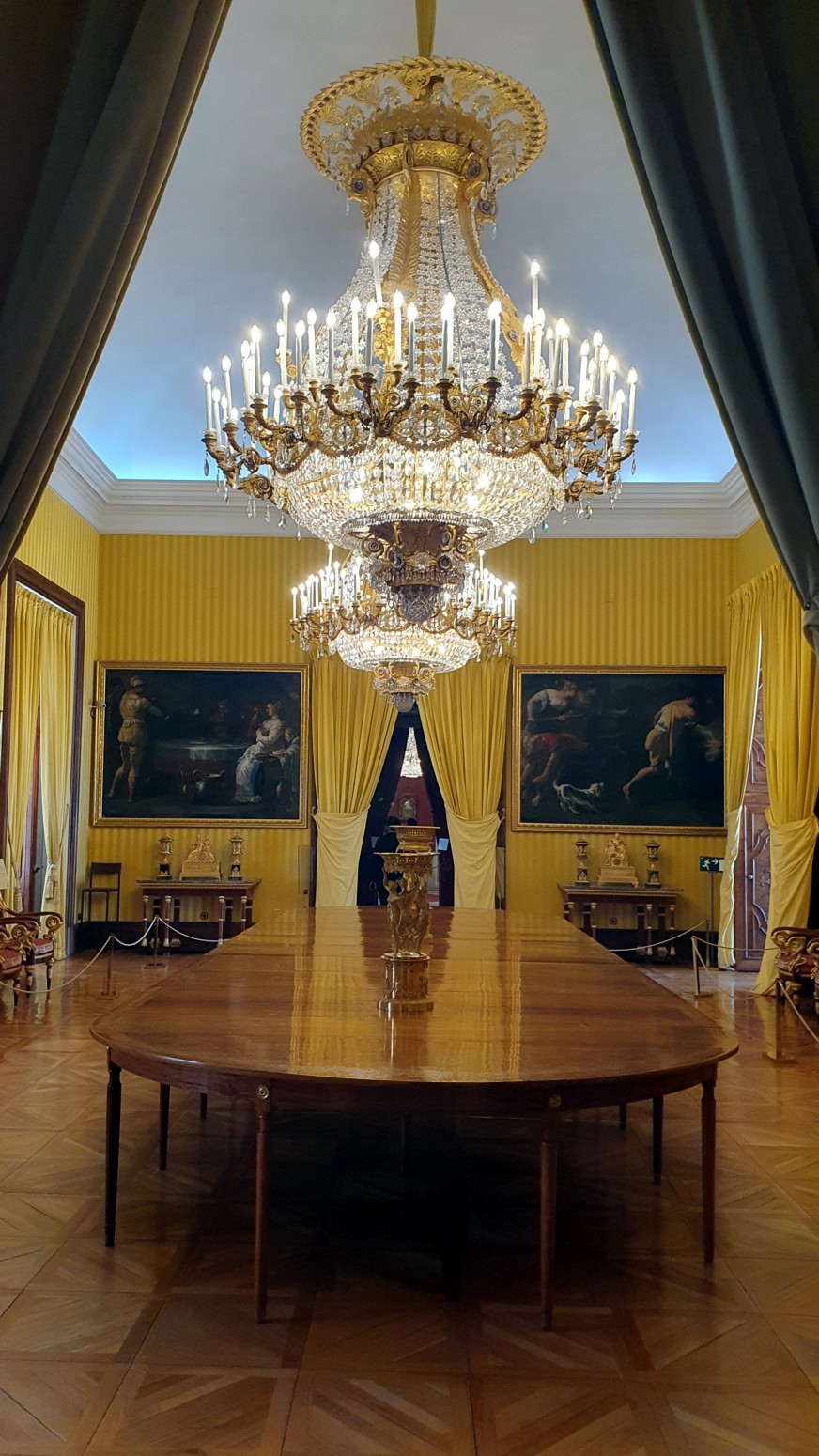 En el interior se empieza por la sala de tapices y se recorren todas las salas y aposentos, siendo el punto culminante el
