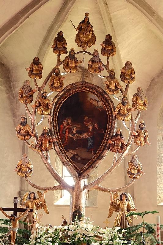 un tema de belleza única, un motivo que representa el árbol genealógico de Jesús. El altar de ocho metros de altura, agitado y multiforme