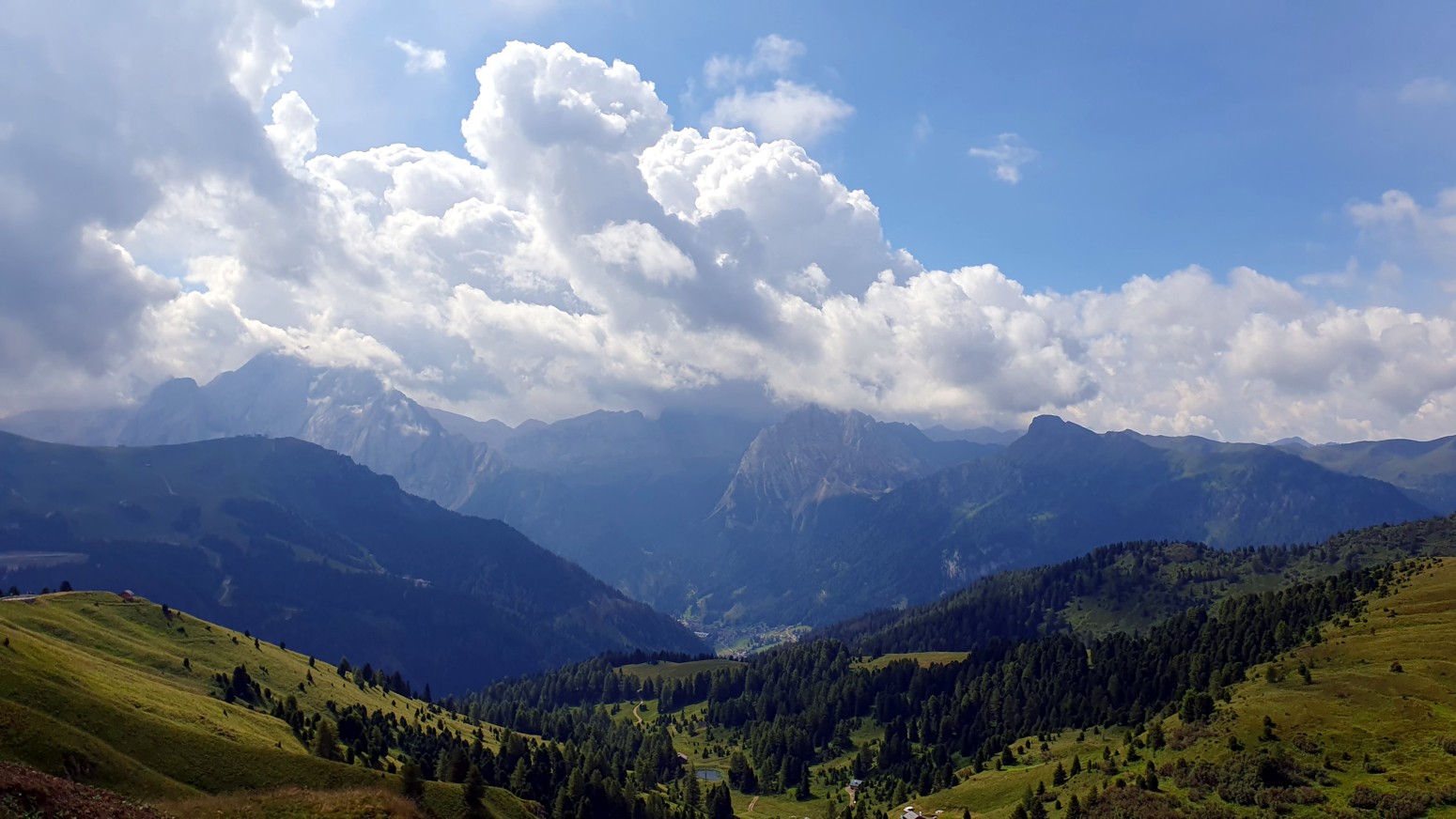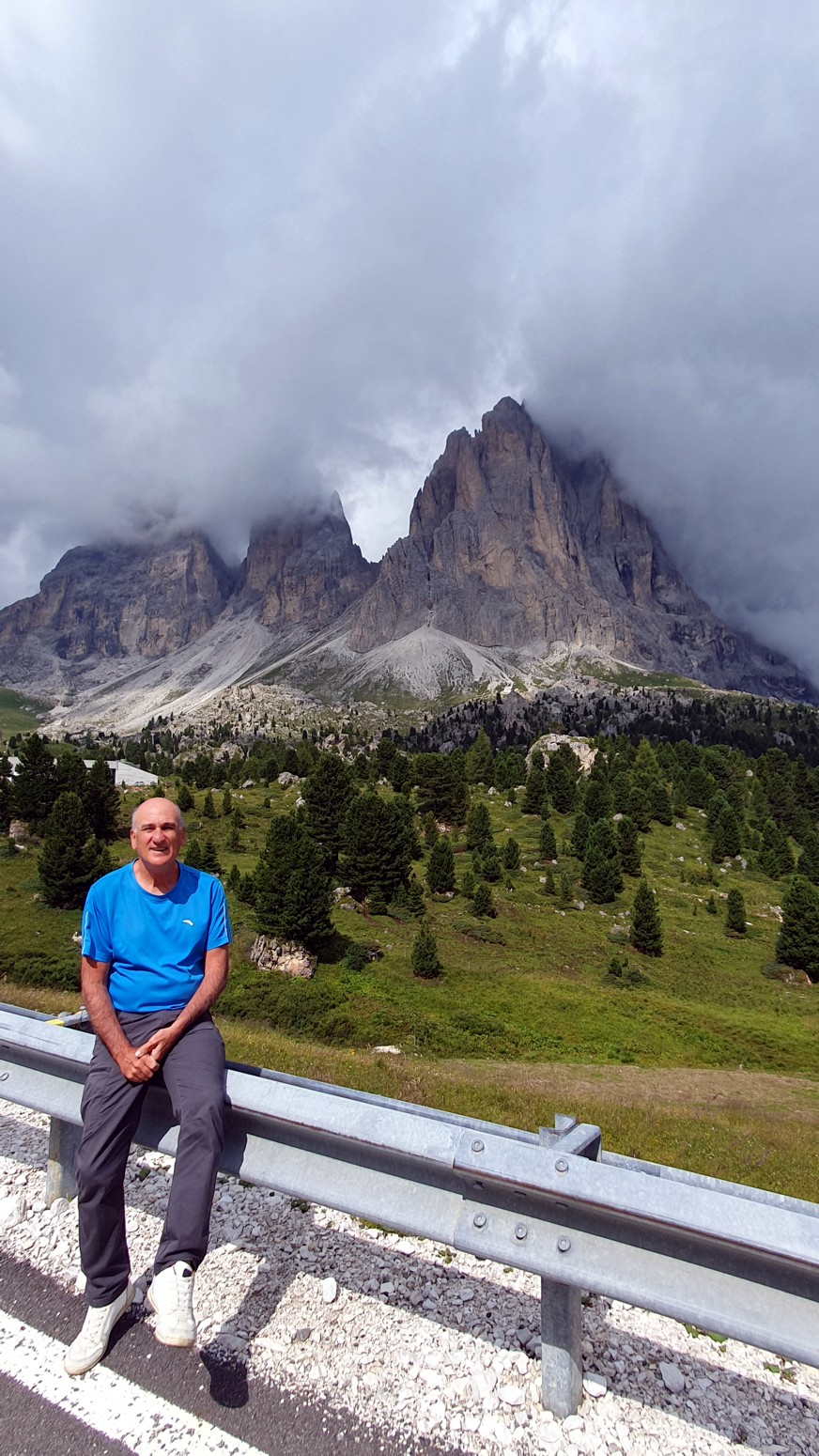 Desde el paso del Sella se pueden admirar en toda su belleza los picos del Sassolungo, la Marmolada, el Grupo del Sella y, más lejos, los