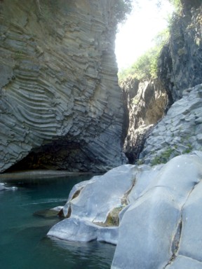 la corriente de un río, esculpiendo un cauce estrecho en cuyas paredes negras se