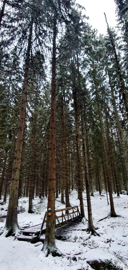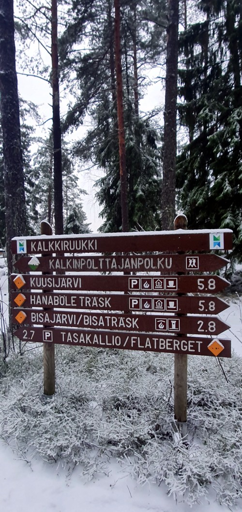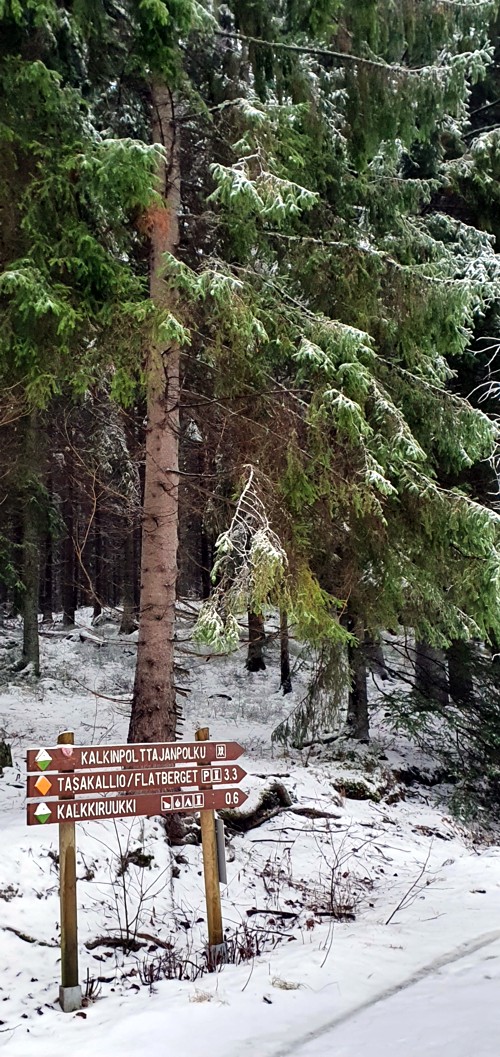 El Kalkinpolttaja trail no es muy largo, unos 5km, y es un fácil recorrido circular. En el punto más alto, la roca de Högberget, encontramos una mesa donde