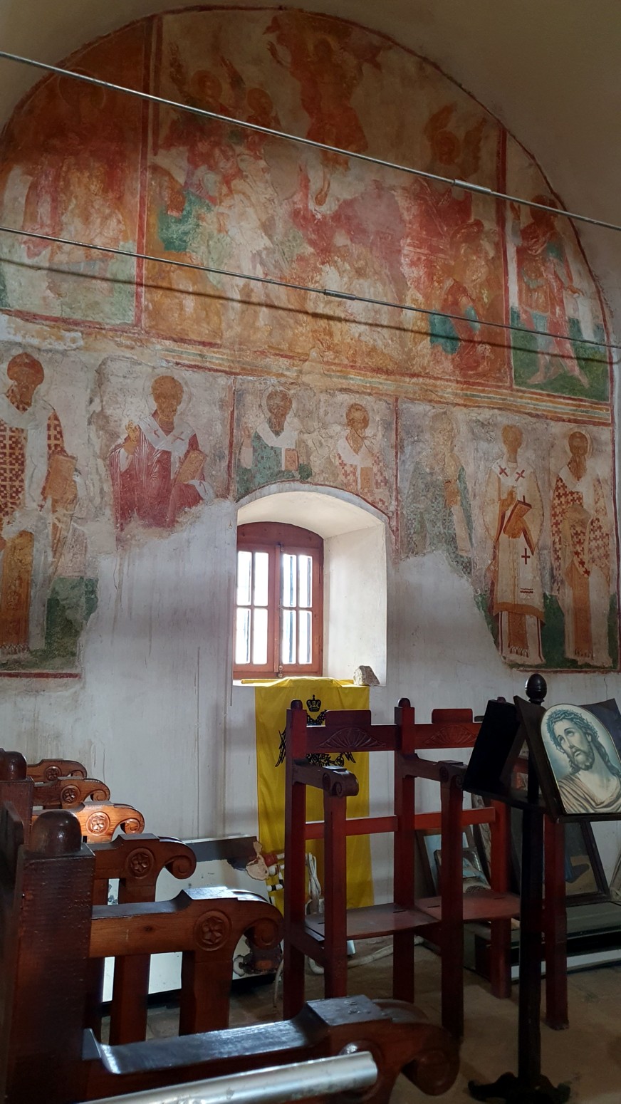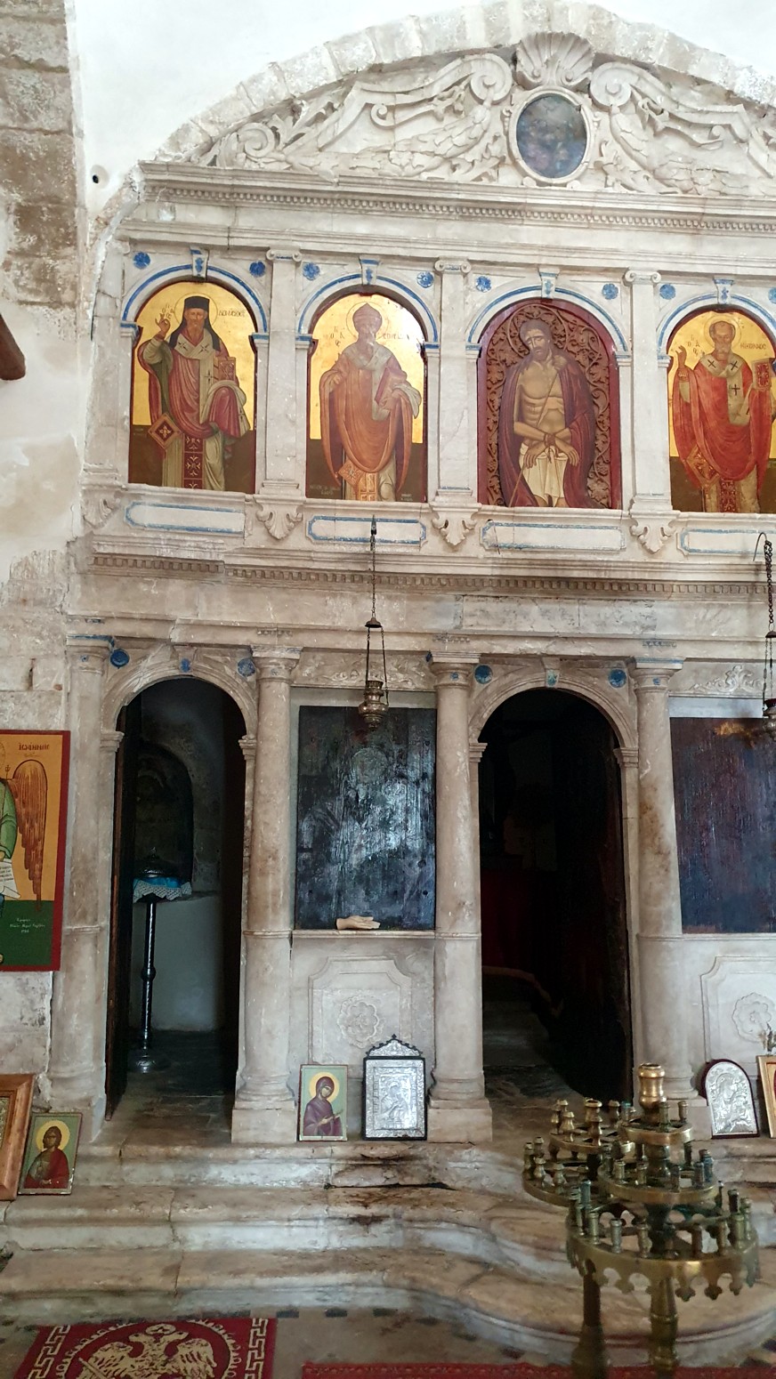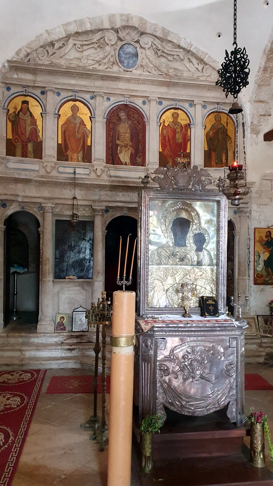 las ofrendas y veréis las hermosas pinturas murales de santos y un icono de la Panagia Skopiotissa.
