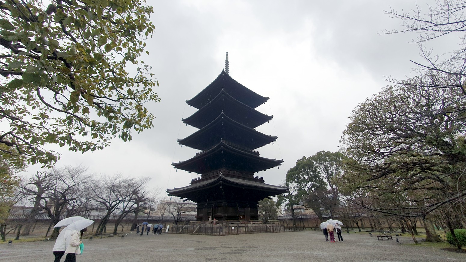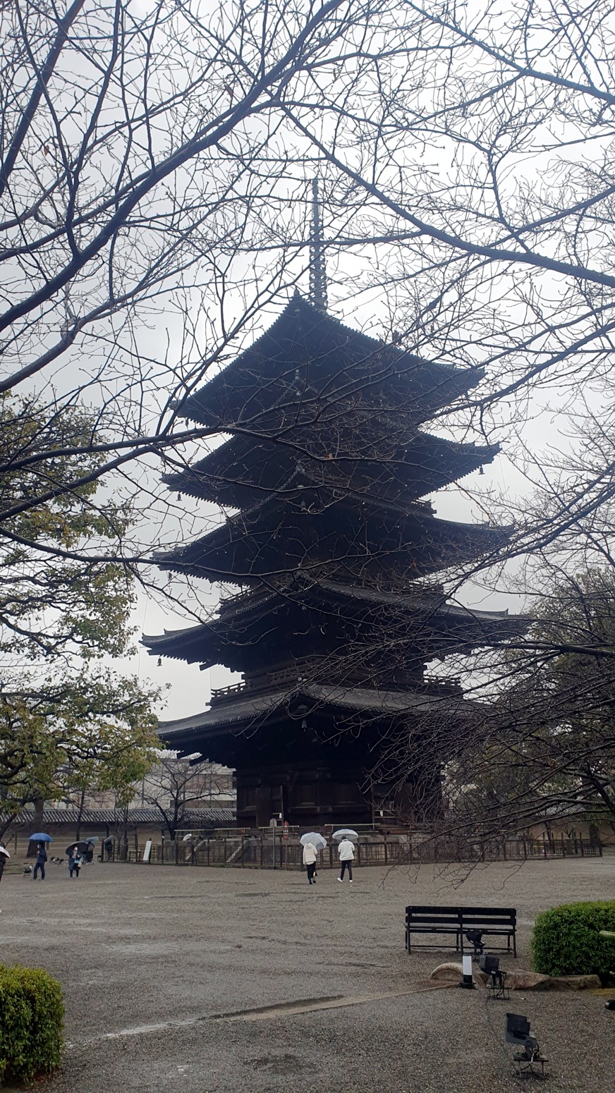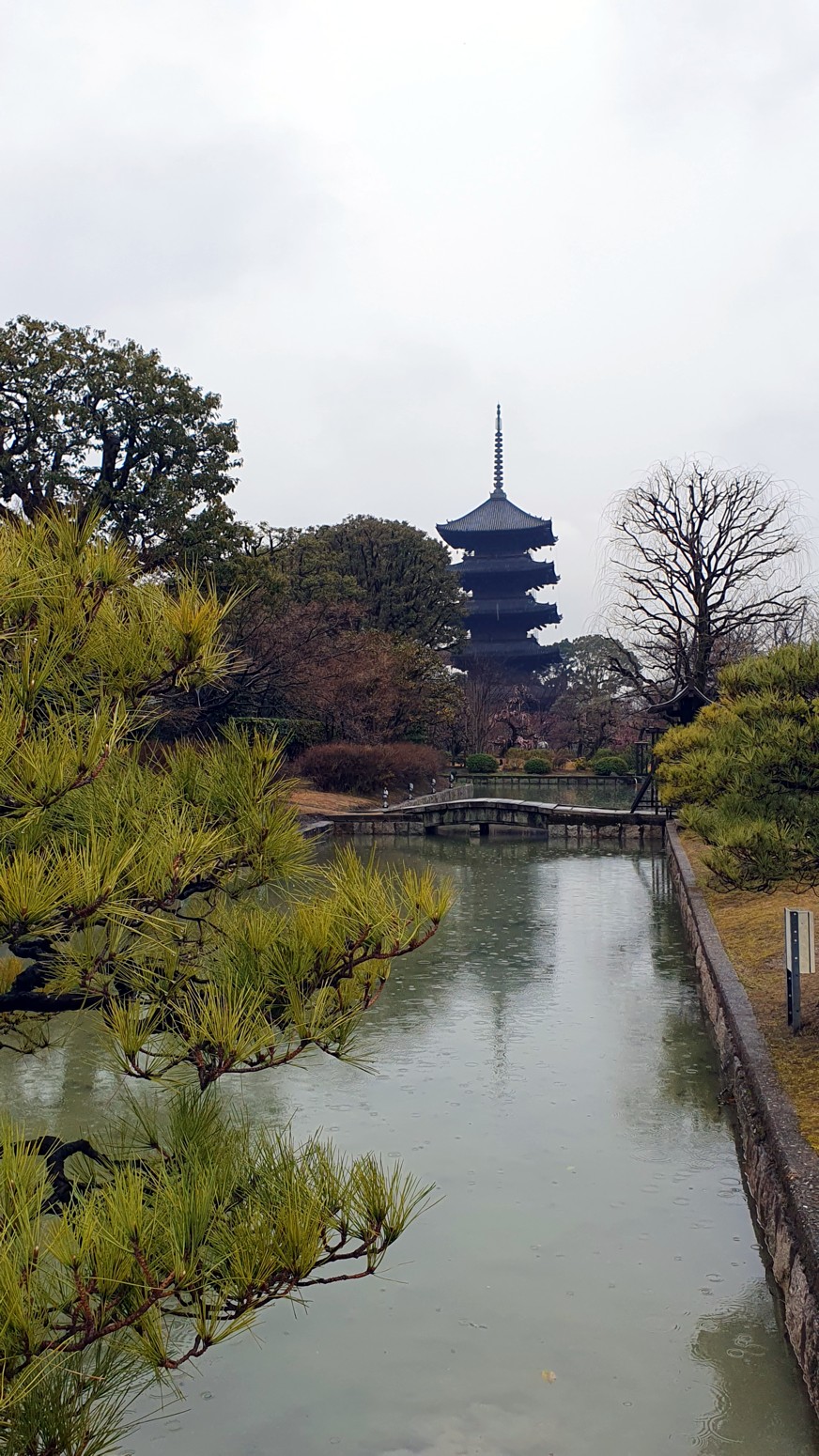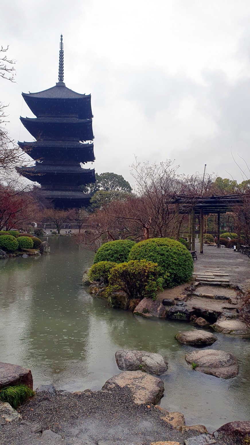 Ya resignado a continuar recorriendo Kyoto bajo la lluvia, me dirijo a la elegante pagoda del Templo Toji (Kyo-o-gokukuji). La pagoda de Toji es un