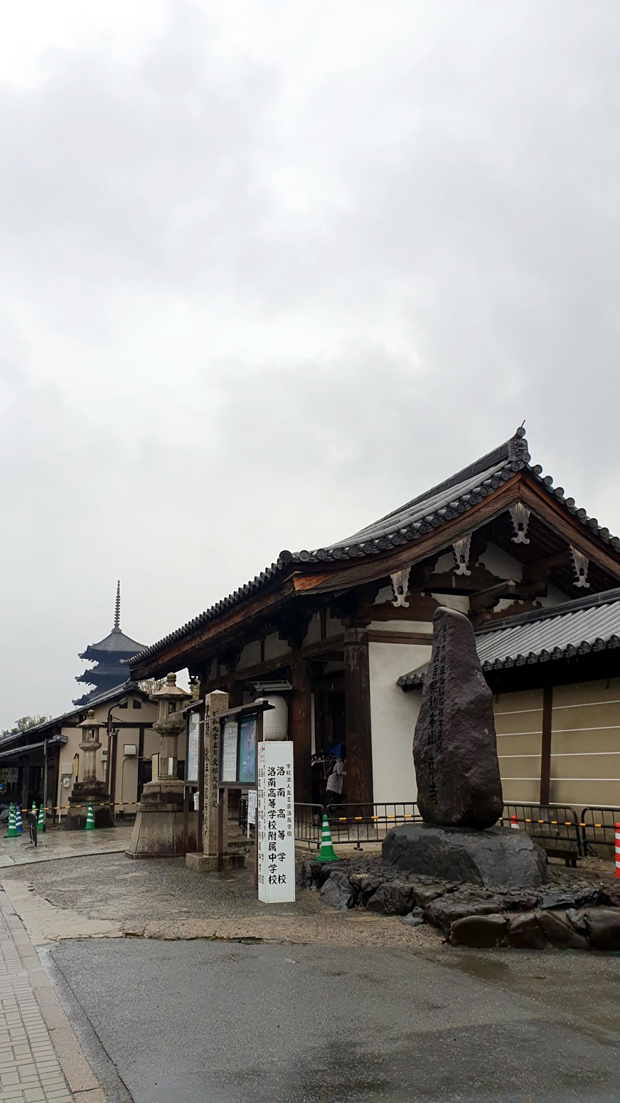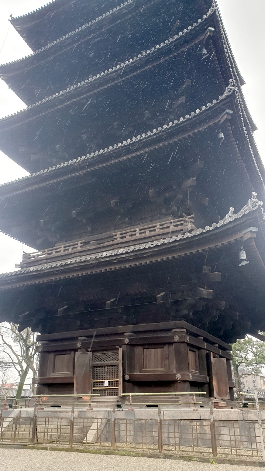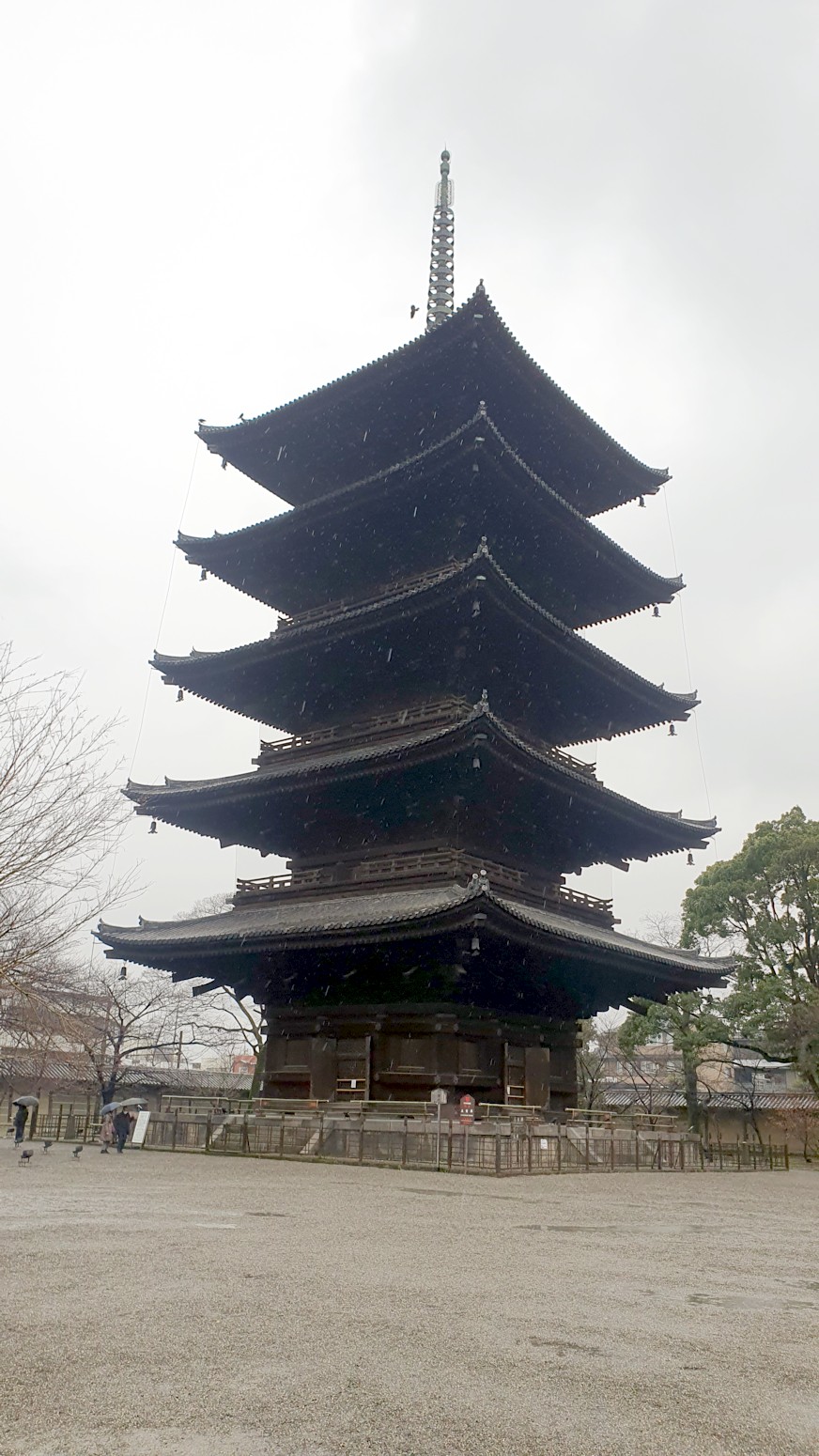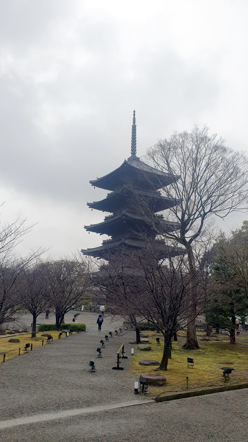 Ya resignado a continuar recorriendo Kyoto bajo la lluvia, me dirijo a la elegante pagoda del Templo Toji (Kyo-o-gokukuji). La pagoda de Toji es un