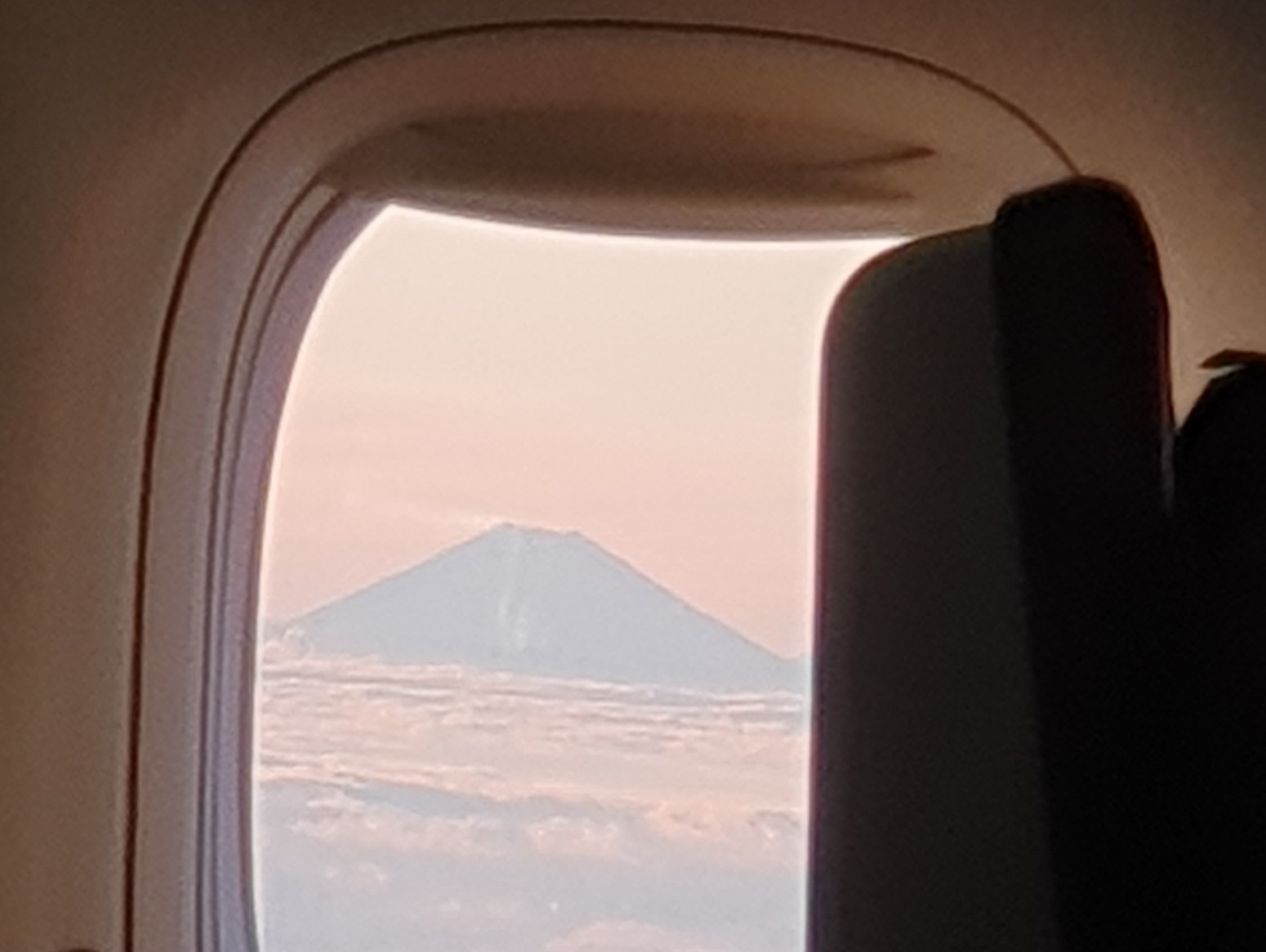 Fuji desde la ventanilla del avión. En seguida anochece y la vista