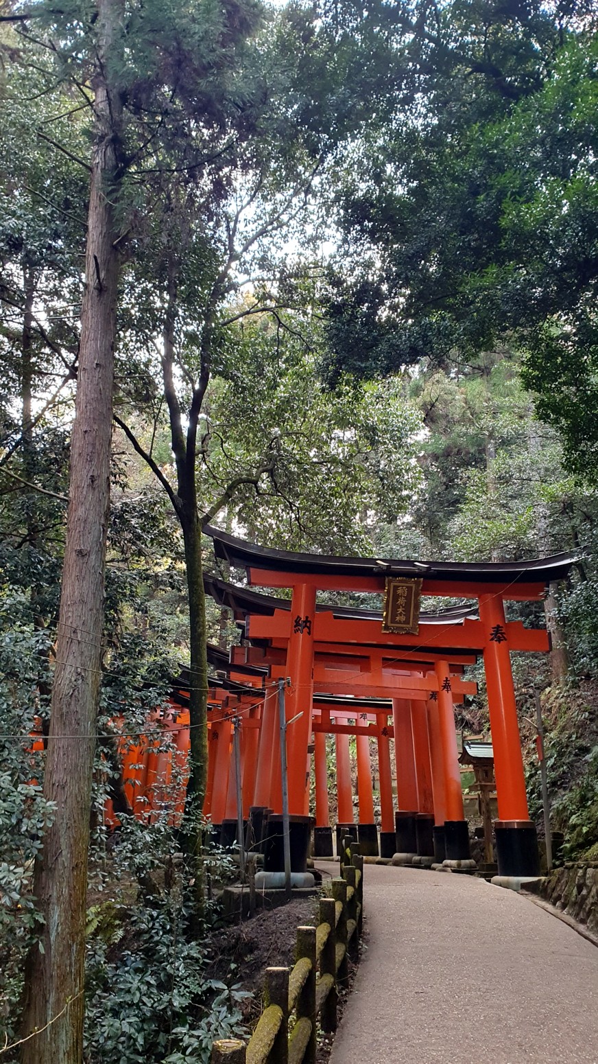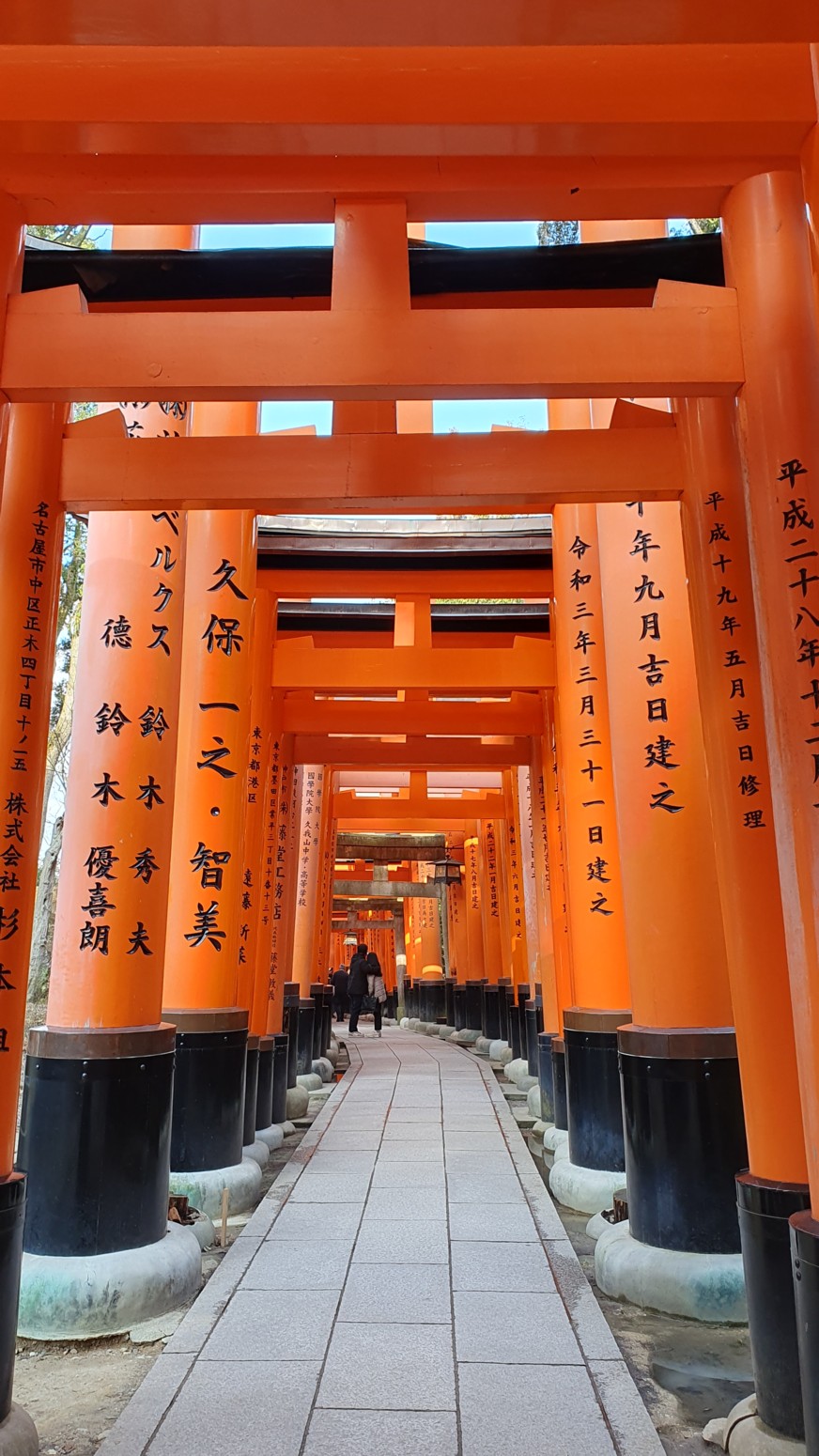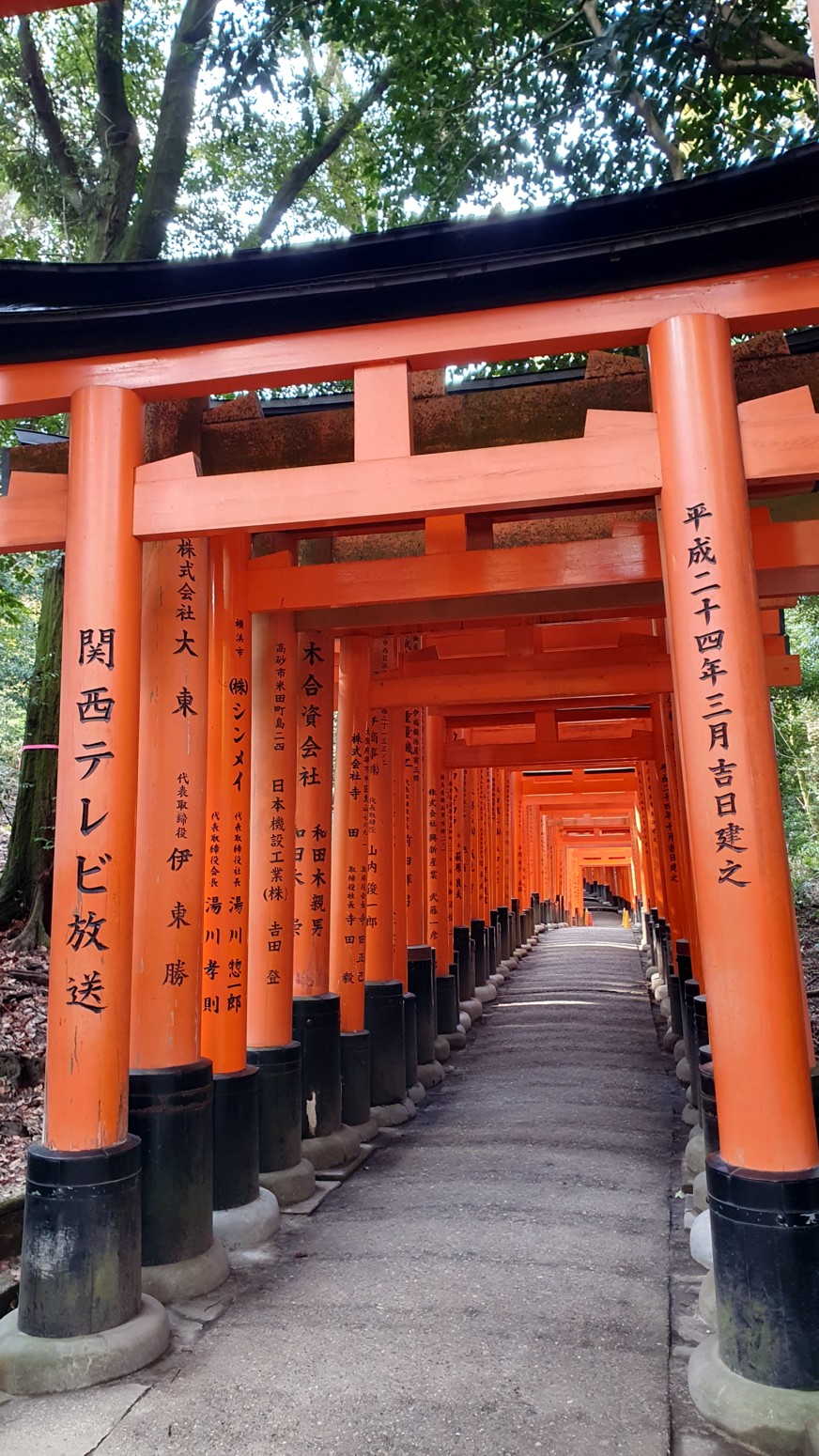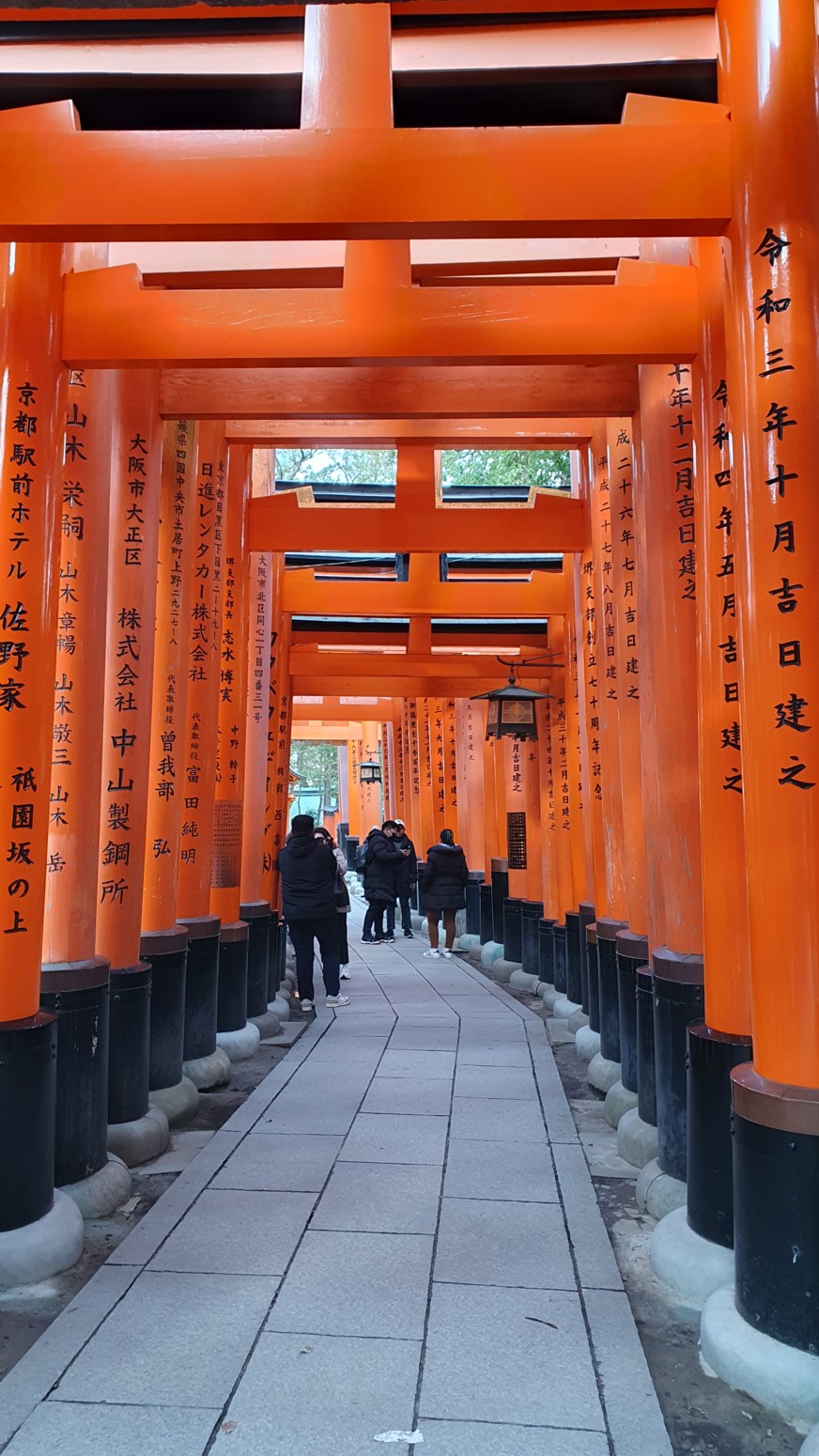caminos, que casi parecen formar un pasadizo techado y que han sido donados por comerciantes que ponen sus nombres o los de sus negocios en los torii para que el dios Inari les