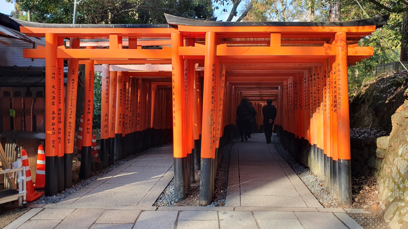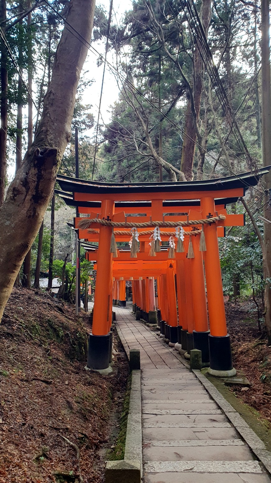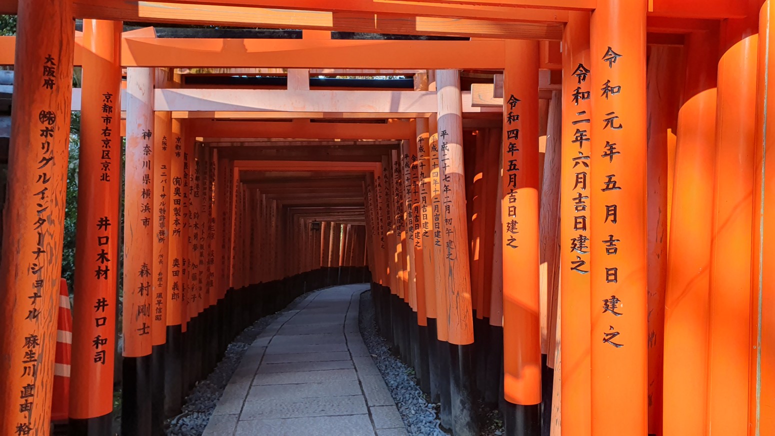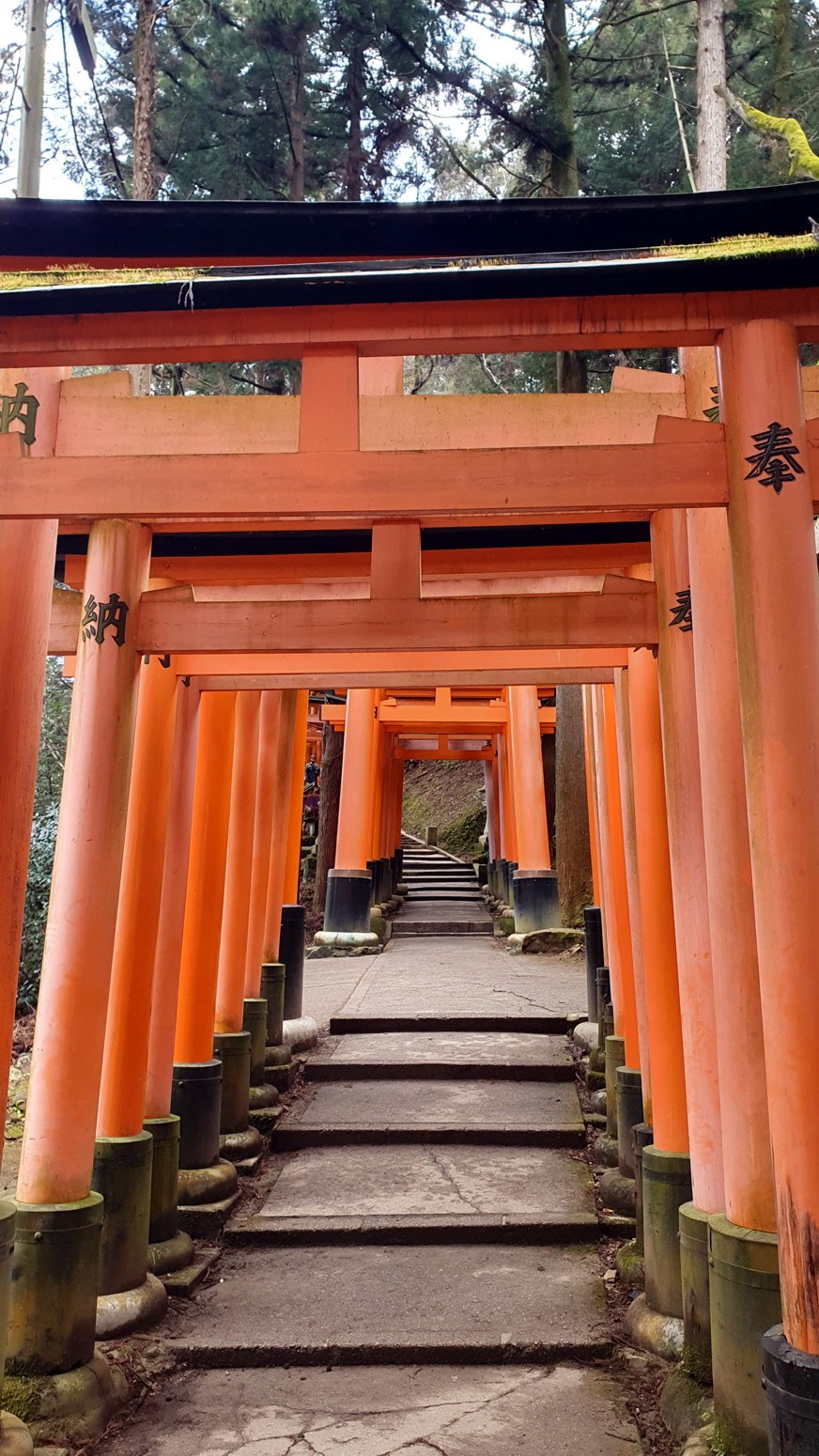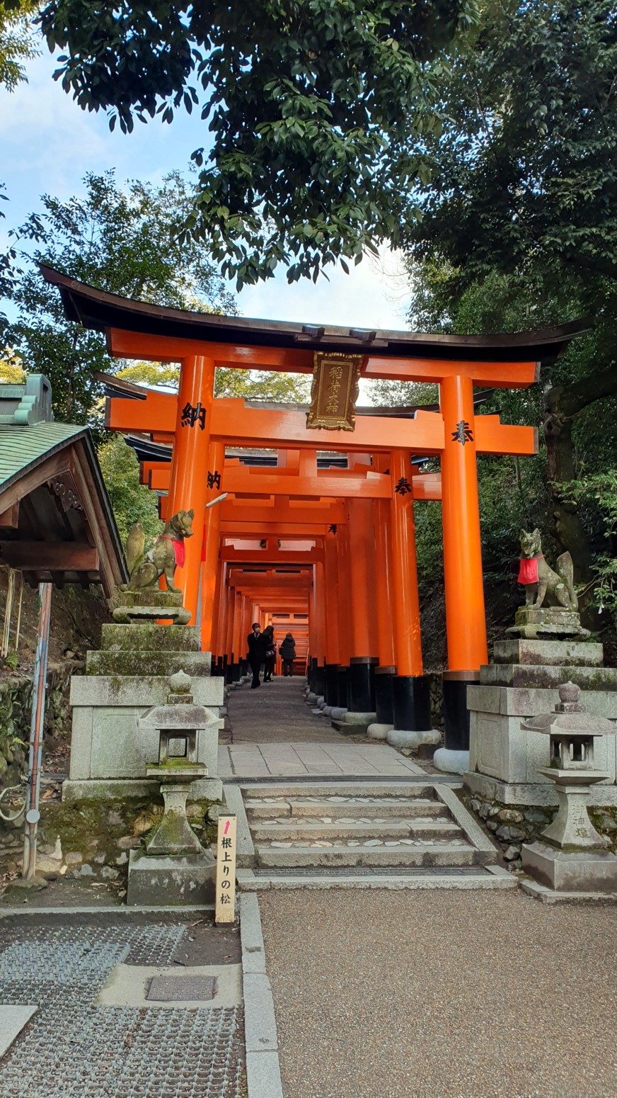 caminos, que casi parecen formar un pasadizo techado y que han sido donados por comerciantes que ponen sus nombres o los de sus negocios en los torii para que el dios Inari les