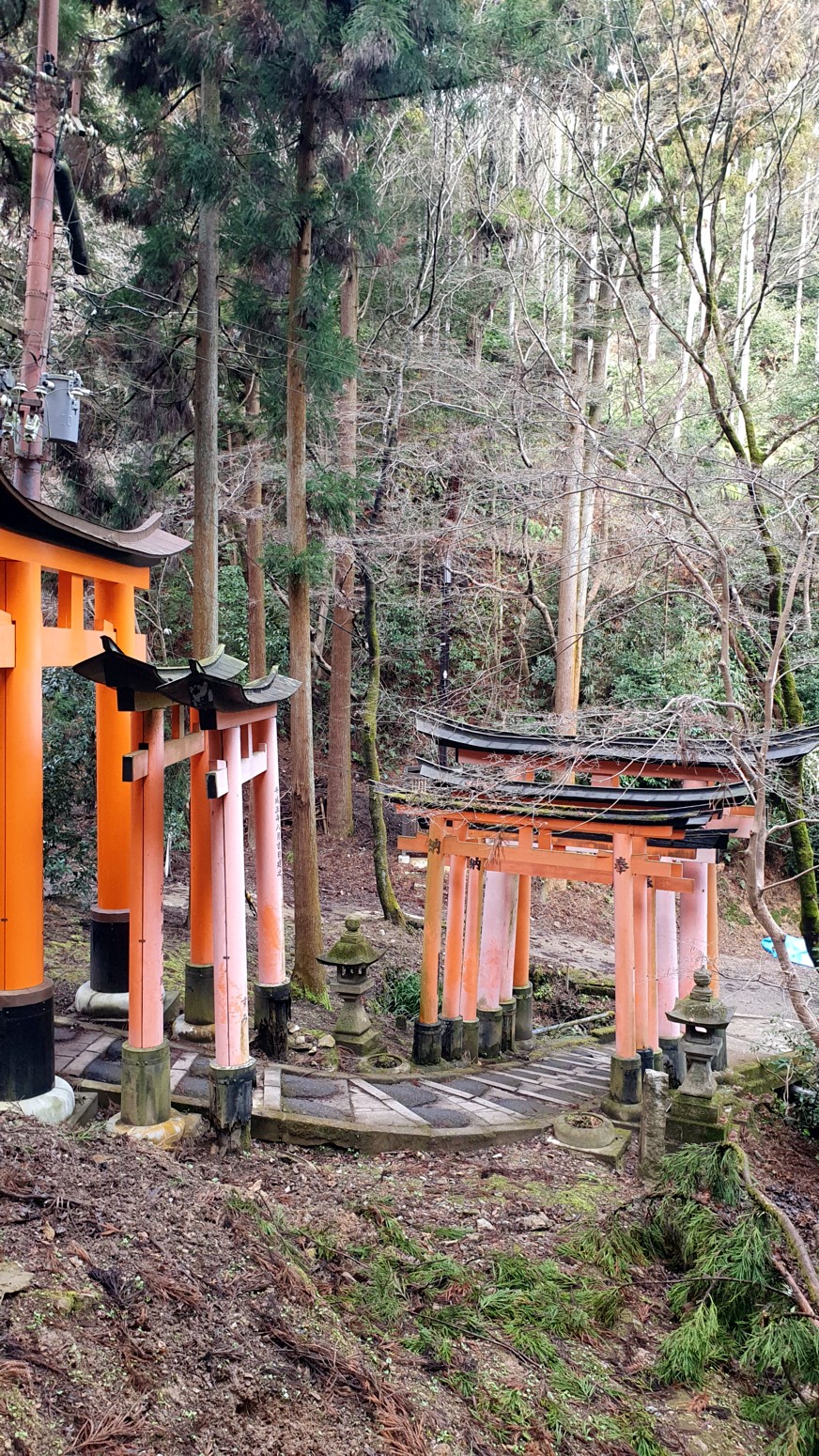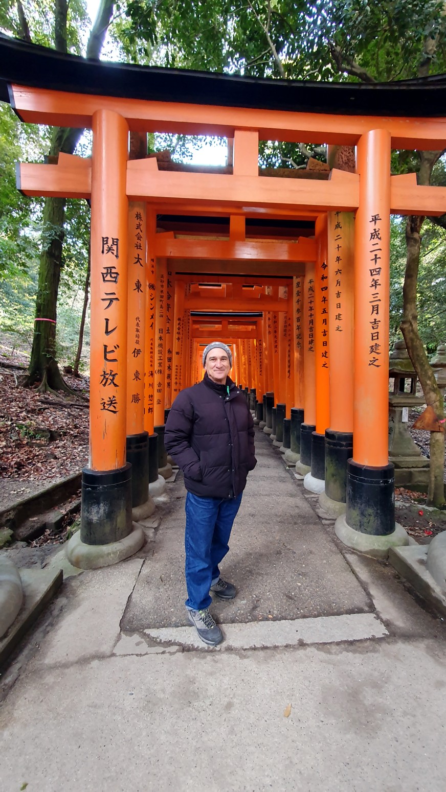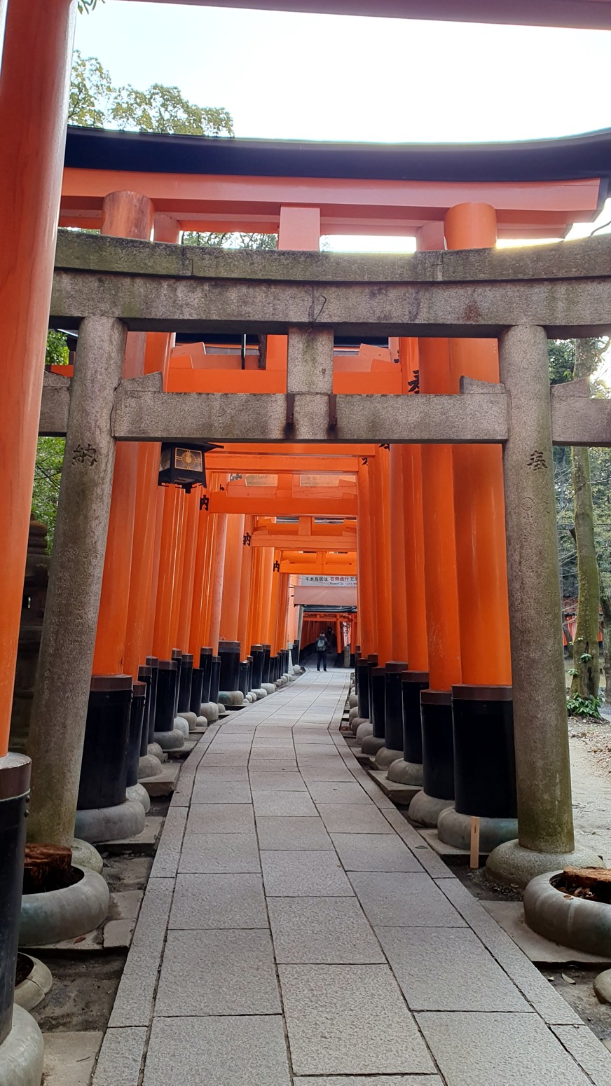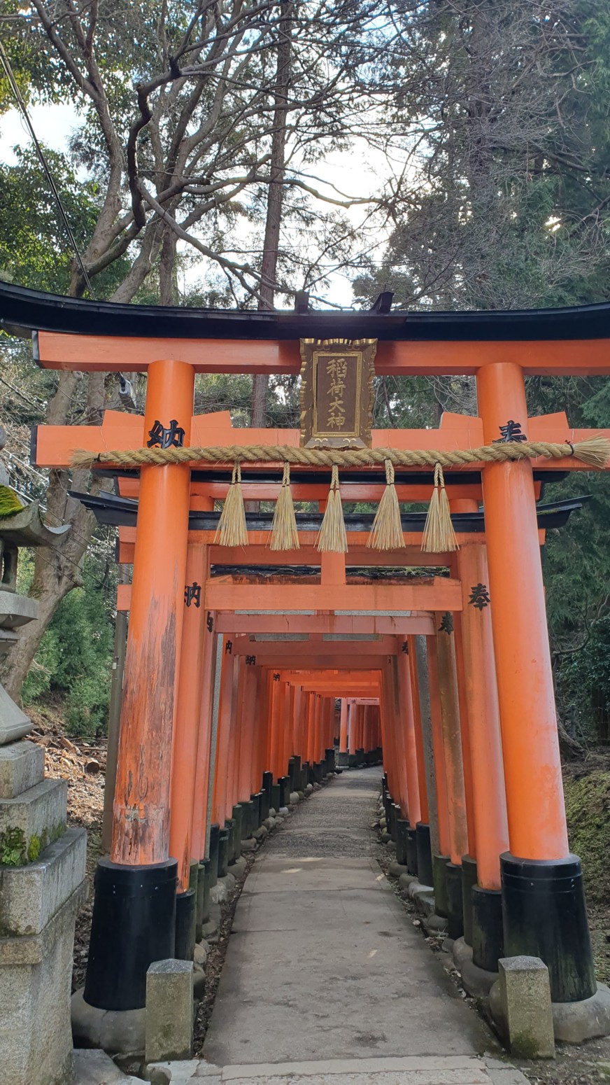 caminos, que casi parecen formar un pasadizo techado y que han sido donados por comerciantes que ponen sus nombres o los de sus negocios en los torii para que el dios Inari les