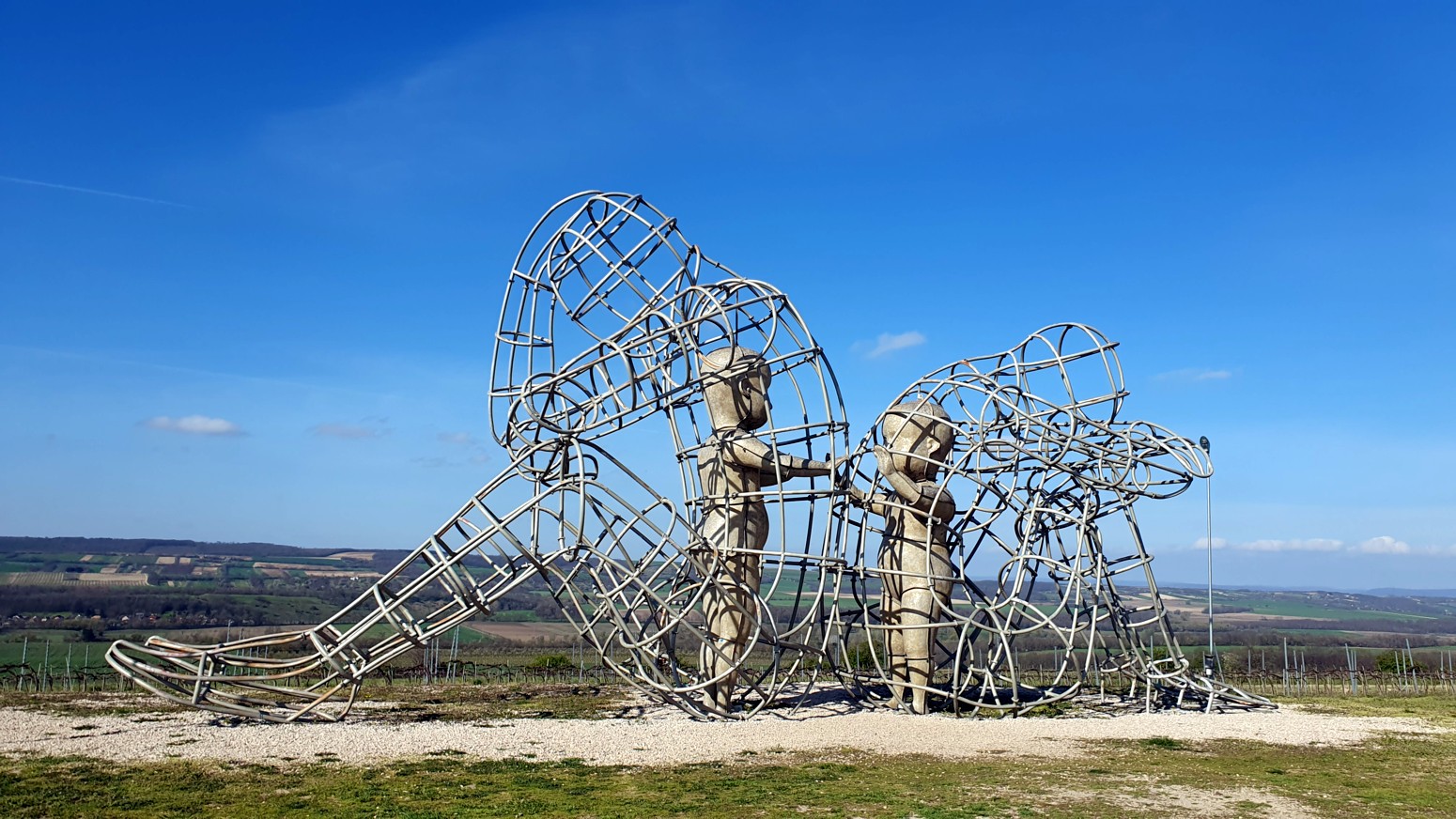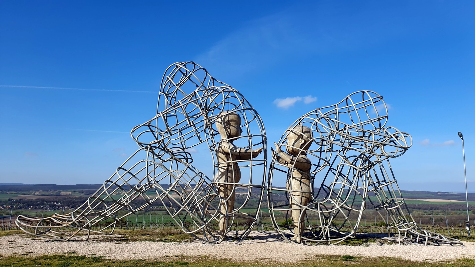espaldas la una a la otra, con dos figuras infantiles una frente a la otra. De acuerdo con la descripción colocada en la colina, los cables