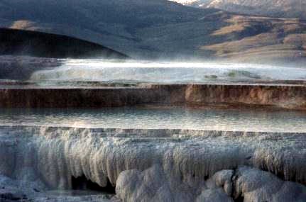 Yellowstone también es una importante zona geotérmica, hay dentro del parque unos 10.000 géisers, manantiales calientes, chorros de vapor, y grandes depósitos de barro en ebullición, tal vez el más conocido es el llamado "Old Faithful",que tiene la particularidad de hacer erupción cada 79 minutos exactamente, es tan exacto que en la cabaña-restaurante que hay junto a él, un reloj indica el tiempo que falta para su próxima erupción, así uno se puede terminar su cerveza sin prisas...