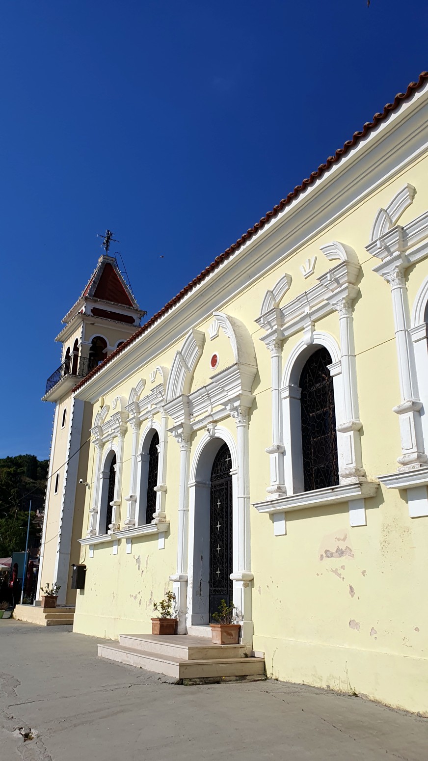 Agios Nikolas, una iglesia de estilo renacentista del siglo XVII, siendo esta de las pocas estructuras que han sobrevivido al temblor sísmico